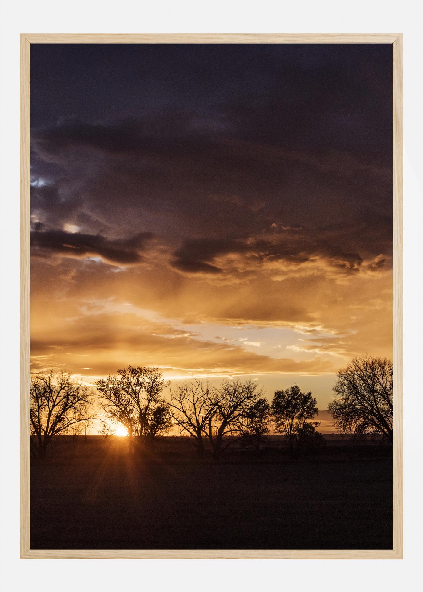 Úžasná tlač oranžového západu slnka. Západ slnka na obzore zvýrazňuje jesenné stromy na poliach. So spektakulárnou oblohou vytvárajú oranžové odtiene teplú a upokojujúcu atmosféru. Fantastický plagát, ktorý prináša teplo do vašej obývačky.