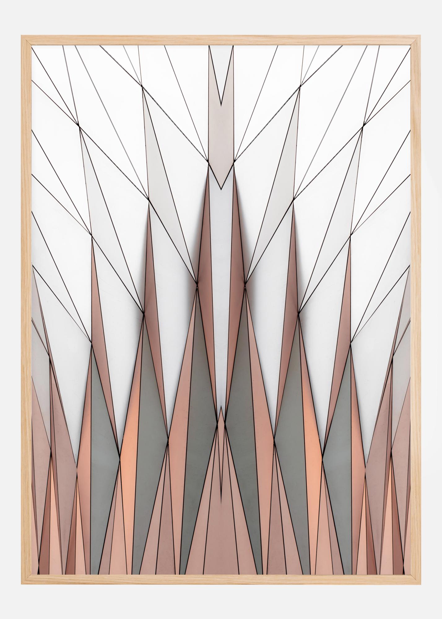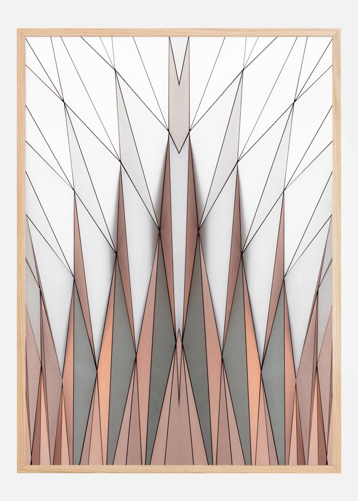 Krásna potlač trojuholníkov. Oranžové a sivé trojuholníky sú umiestnené v spodnej časti potlače a smerujú nahor. Zvyšné diamantové trojuholníky však pokrývajú hornú polovicu potlače. Úžasný plagát, keď chcete získať pocit priestoru. Perfektné pre stenu obývačky.