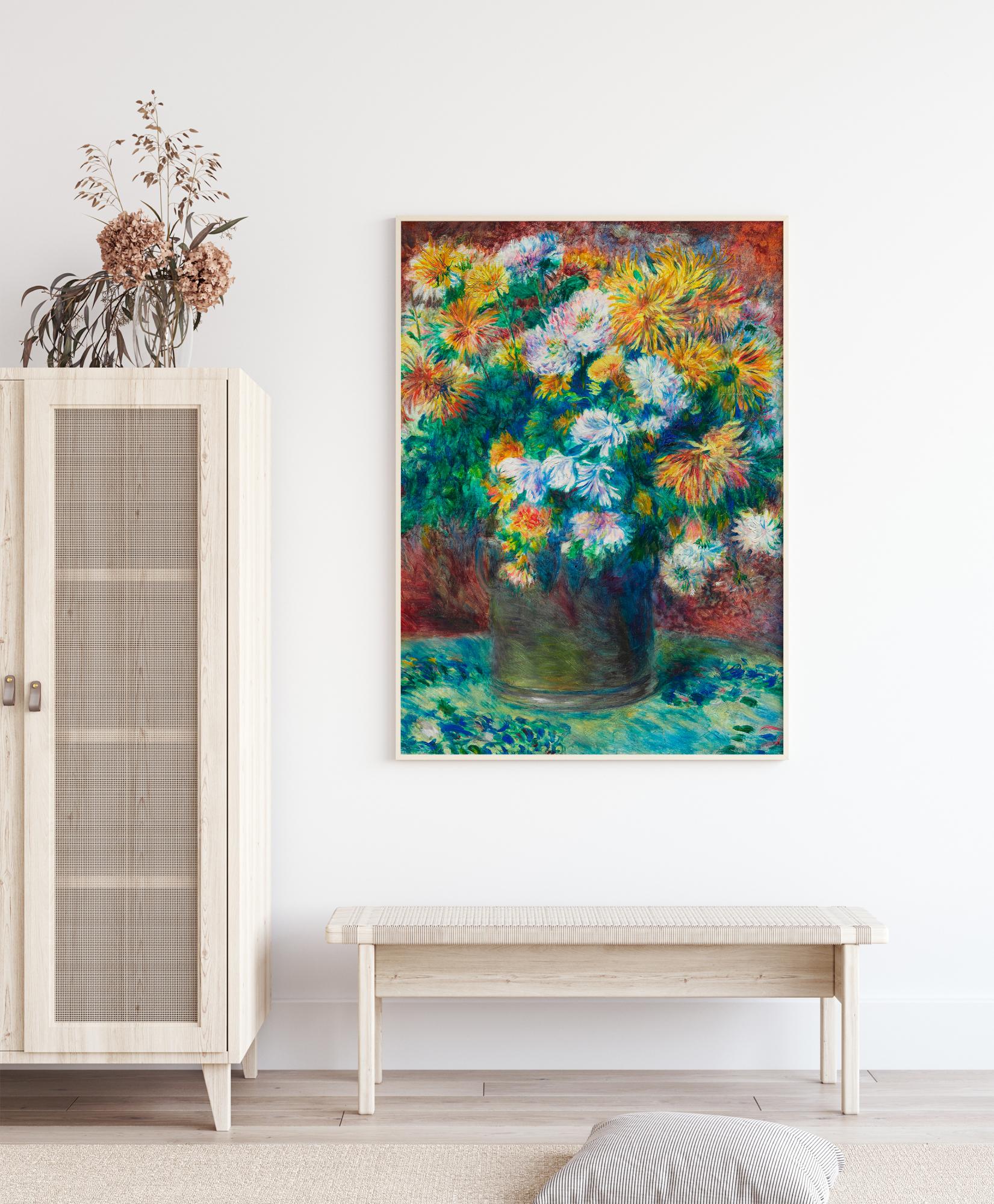 Pestrofarebný maľovaný plagát s kvetinovou kyticou. Na viacfarebnom pozadí vytvára táto krásna farebná škála veselú atmosféru. Kvety sú umiestnené na tyrkysovo sfarbenom plátne, ktoré zvýrazňuje všetky jasné farby na tomto obrázku. Perfektná tlač pre všetkých, ktorí milujú kvety.