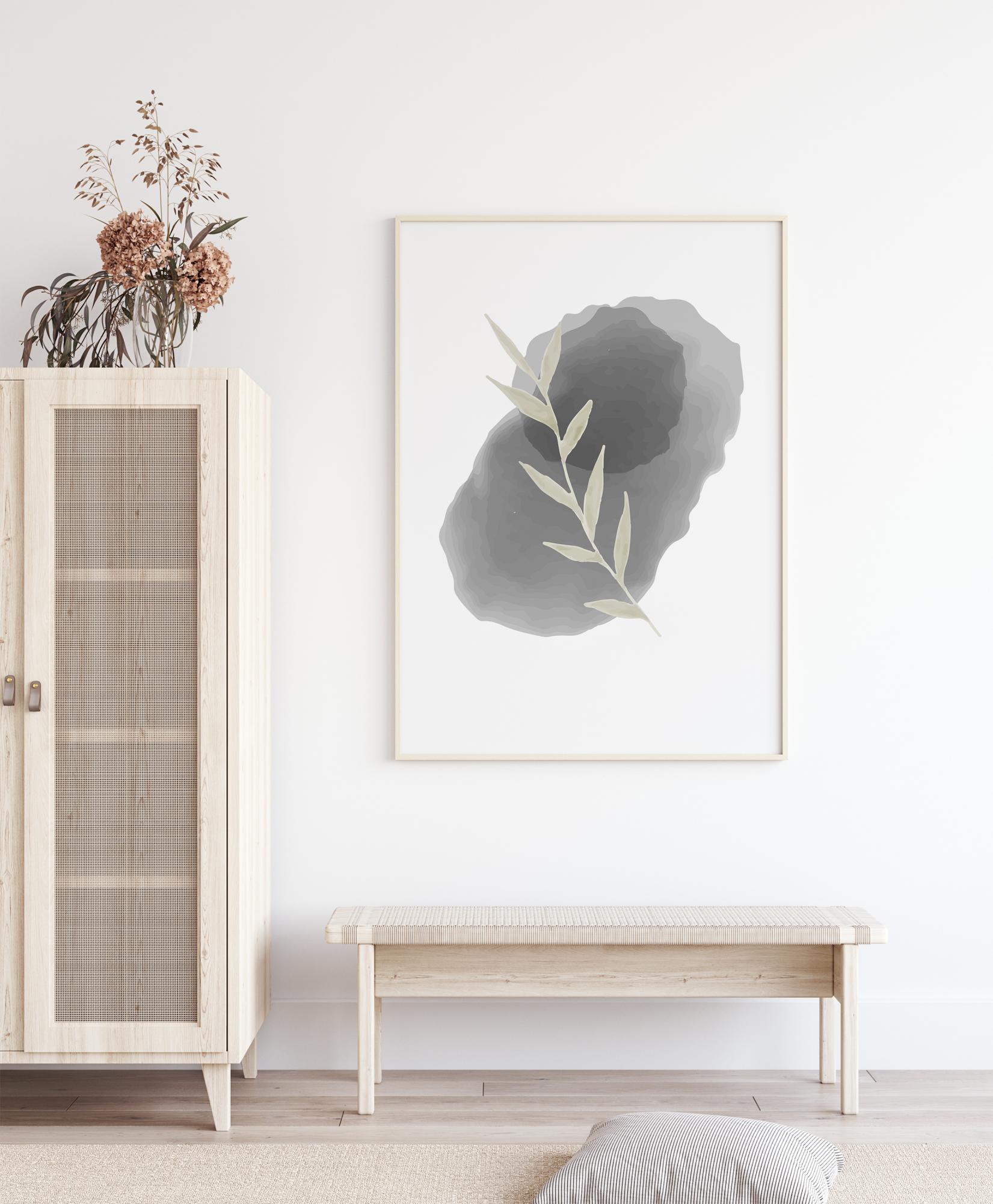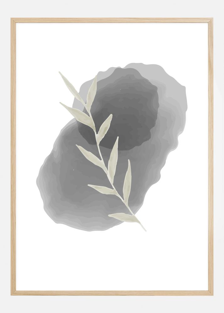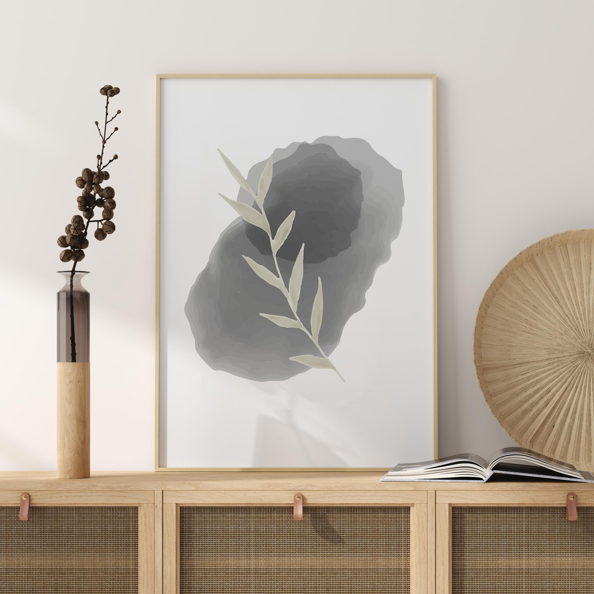 Jednoduchý odtlačok béžového listu umiestneného na oválnom kameni. Na bielom pozadí je list umiestnený na dvoch rôznych kameňoch: malom čiernom kameni umiestnenom na väčšom béžovom kameni. Dodajte svojmu domovu dotyk jemnosti s týmto plagátom.