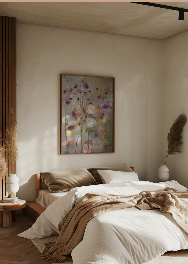 Úžasná ručne maľovaná potlač fialových a bielych sušených kvetov. Na béžovom pozadí vytvárajú prirodzené farby kvetov uvoľňujúcu atmosféru. Jemné zelené, fialové a oranžové tóny sú veľmi príjemné pre oko. Krásny poster, ktorý sa hodí vedľa vášho toaletného stolíka.