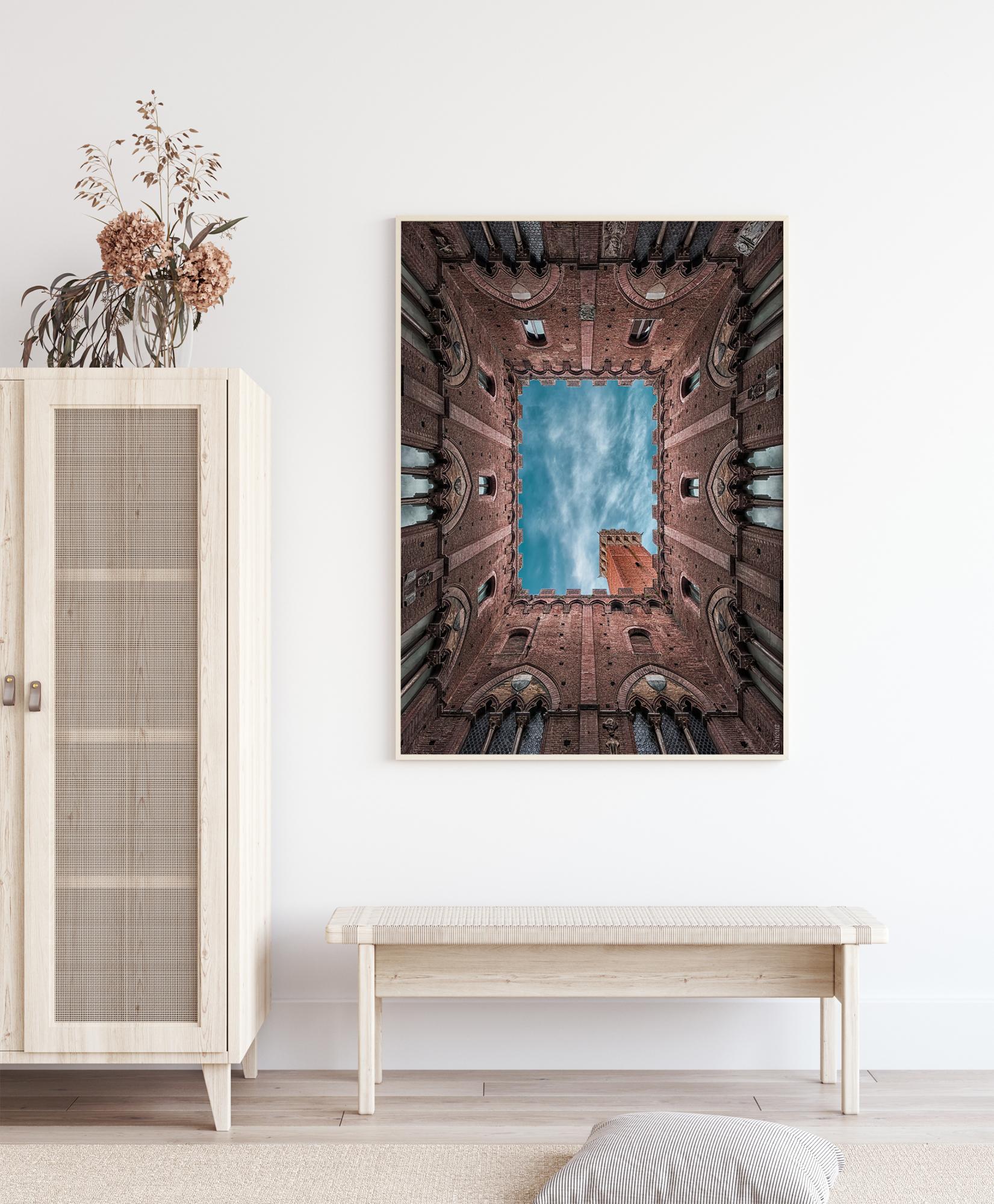 Perspektívny plagát, zdola nahor, Palazzo Pubblico v Siene, Taliansko. So svetlomodrou oblohou, ktorá žiari jasne a zreteľne, sú gotické okná na každej strane budovy jasne viditeľné. Keď sa pozriete nahor k oblohe, môžete si všimnúť veľkolepú vežu s hodinami. Prineste si kúsok talianskej architektúry do vášho domova pomocou tejto úžasnej tlače.