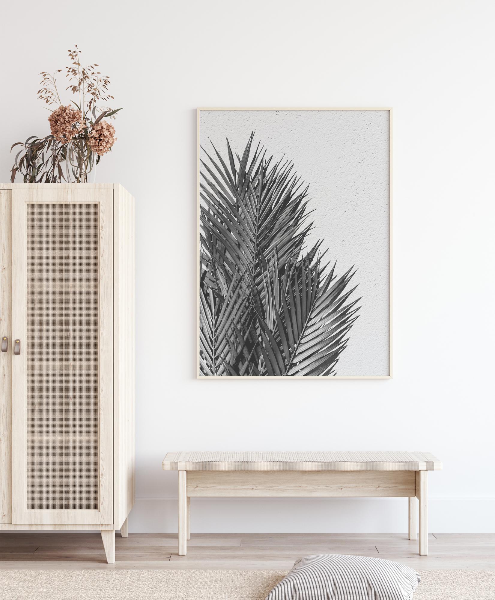 Čiernobiely plagát s palmami, ktoré sa opierajú o drsnú bielu stenu. Drsná stena zdôrazňuje palmové listy, ktoré ležia na sebe. Keď stojíte naľavo od obrazu, môžete takmer cítiť, ako teplo dosahuje listy. Zaveste tento obraz vo vašom letnom dome pre tropickú atmosféru.