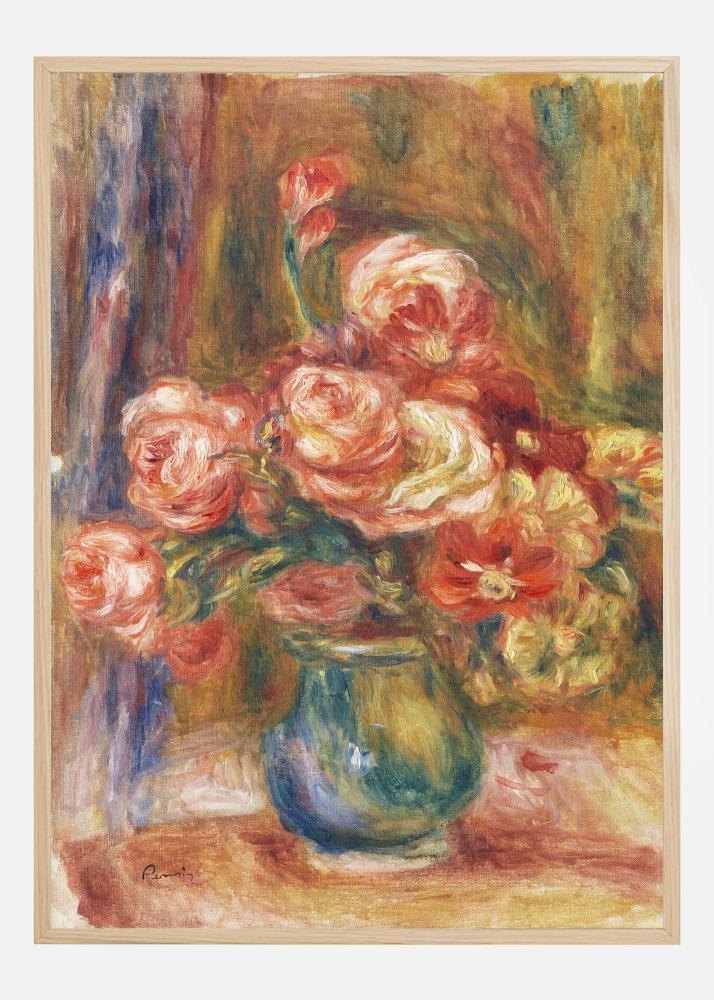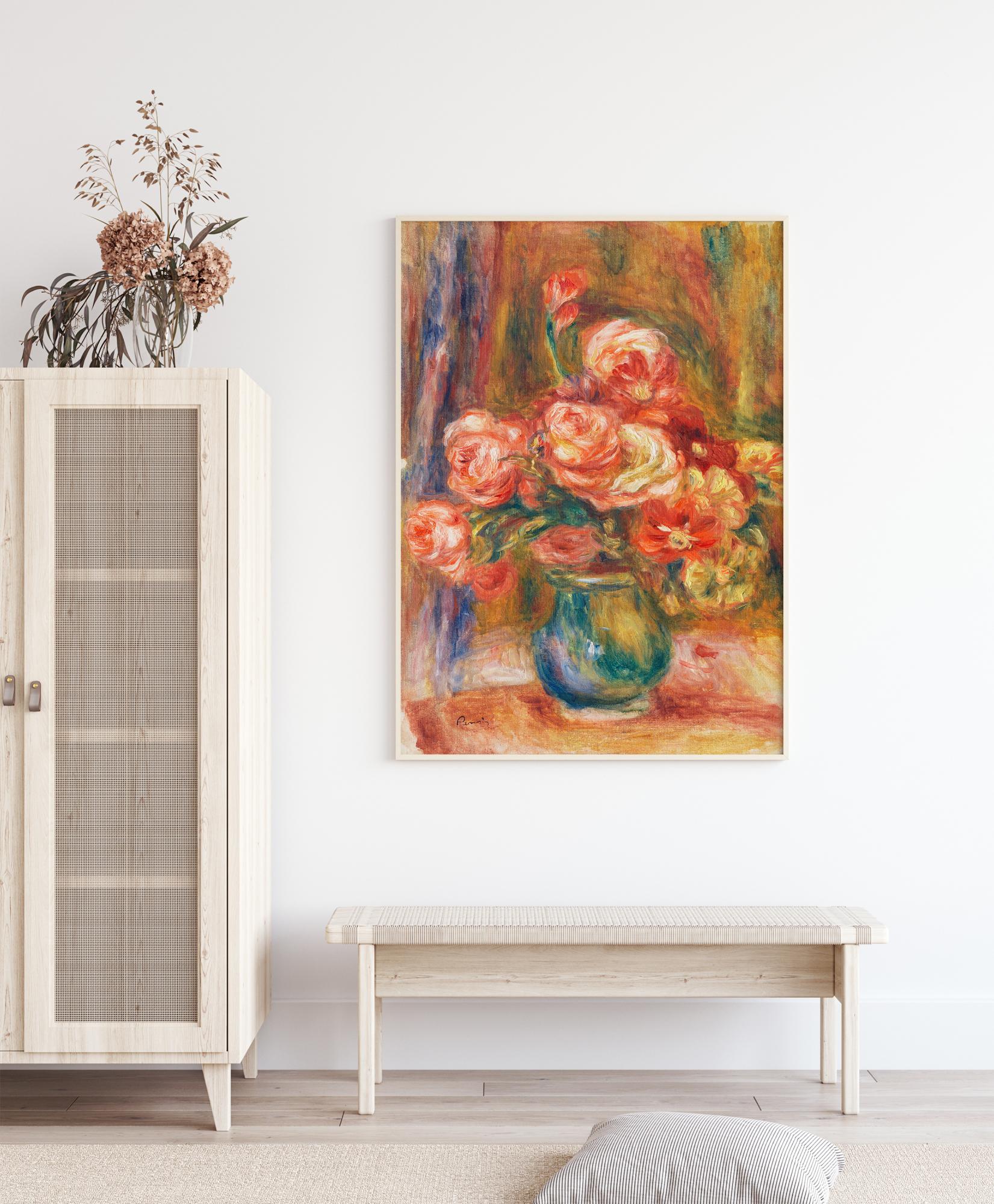 Krásna ručne maľovaná ružová kytica. Tento úžasný výtlačok oranžových a červených ruží v zelenej a pestrej váze vytvára teplý a upokojujúci pocit. Kombinácia farieb na viacfarebnom pozadí dokonale splýva do seba. Nechajte svoj domov žiariť pomocou tohto nádherného plagátu.