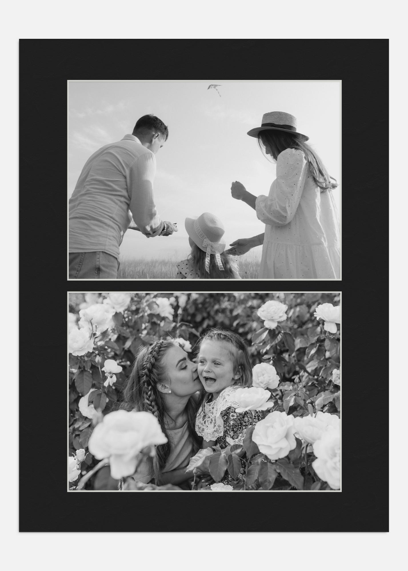 Bezfarebný čierny collage pasparta so šikmo rezanými bielymi okrajmi najvyššej kvality. V pasparte je miesto pre 2 obrázky. Perfektné, keď si chcete vytvoriť vlastnú fotokoláž.