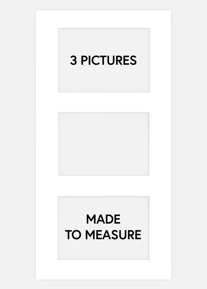 Tu si môžete pohodlne objednať kolážne passepartouty s miestom pre 3 obrázky. Na objednanie zadajte vonkajšie rozmery passepartoutu (ktoré by mali byť rovnaké ako rozmery rámu, ktorý chcete použiť), potom zadajte požadovaný vnútorný rozmer, ktorý by mal byť vždy o 1 cm menší ako obrázky, ktoré chcete použiť. Môžete si objednať len v prípade, že máte tri obrázky rovnakej veľkosti, ak si želáte pokročilejšie kolážne passepartouty, musíte kontaktovať našu zákaznícku službu so svojou objednávkou.