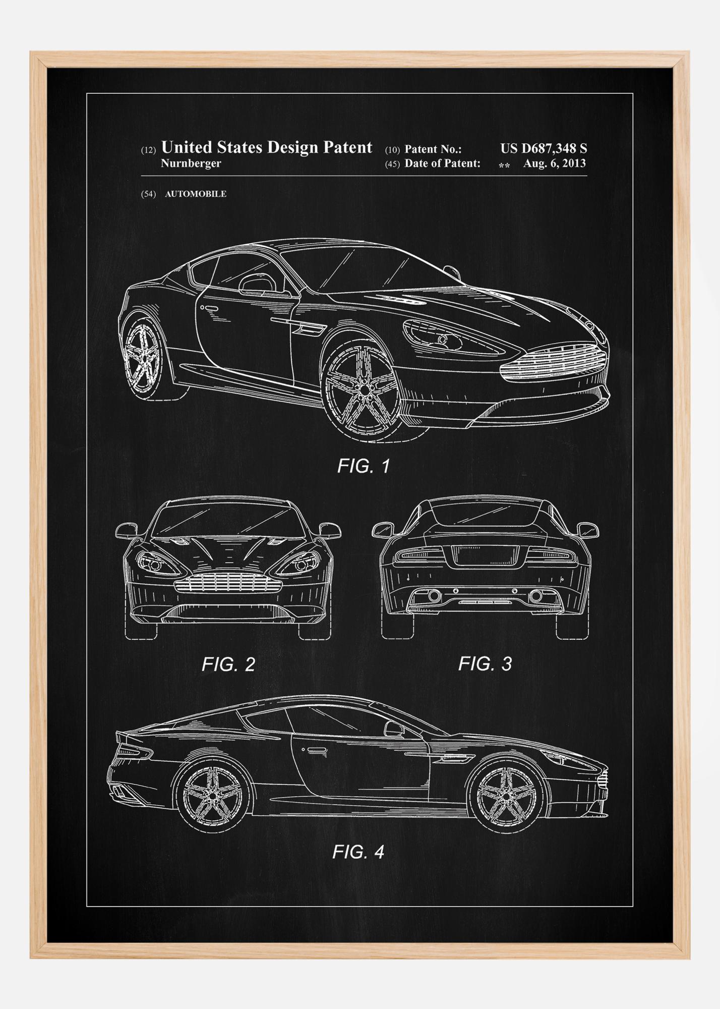 Tento čiernobiely patentový plagát predstavuje exkluzívny dizajn vozidla Aston Martin, registrovaný pod americkým patentovým číslom US D687,348 S datovaným 6. augusta 2013. Patentový plagát zvýrazňuje estetický a funkčný prielom v automobilovom priemysle a je poctou pokrokom v dizajne áut. Je to kreatívny detail pre všetkých, ktorí oceňujú technický dizajn, a je nevyhnutnosťou pre zberateľov a technologických nadšencov.