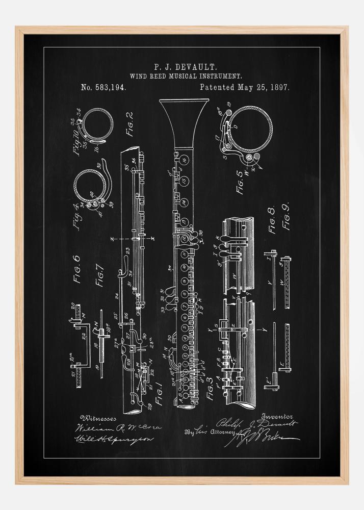 Predstavuje túto veľkolepú patentovanú ilustráciu, poctu hudobnej inovácii a dizajnu. Tento plagát zobrazuje klarinet P.J. DeVaulta, patent vydaný 25. mája 1897 pod číslom 583,194. Táto presná reprodukcia pôvodného patentového nákresu znázorňuje komplexnú mechaniku a krásu nástroja, perfektný doplnok pre každú miestnosť, kde sa oceňuje hudba a história.