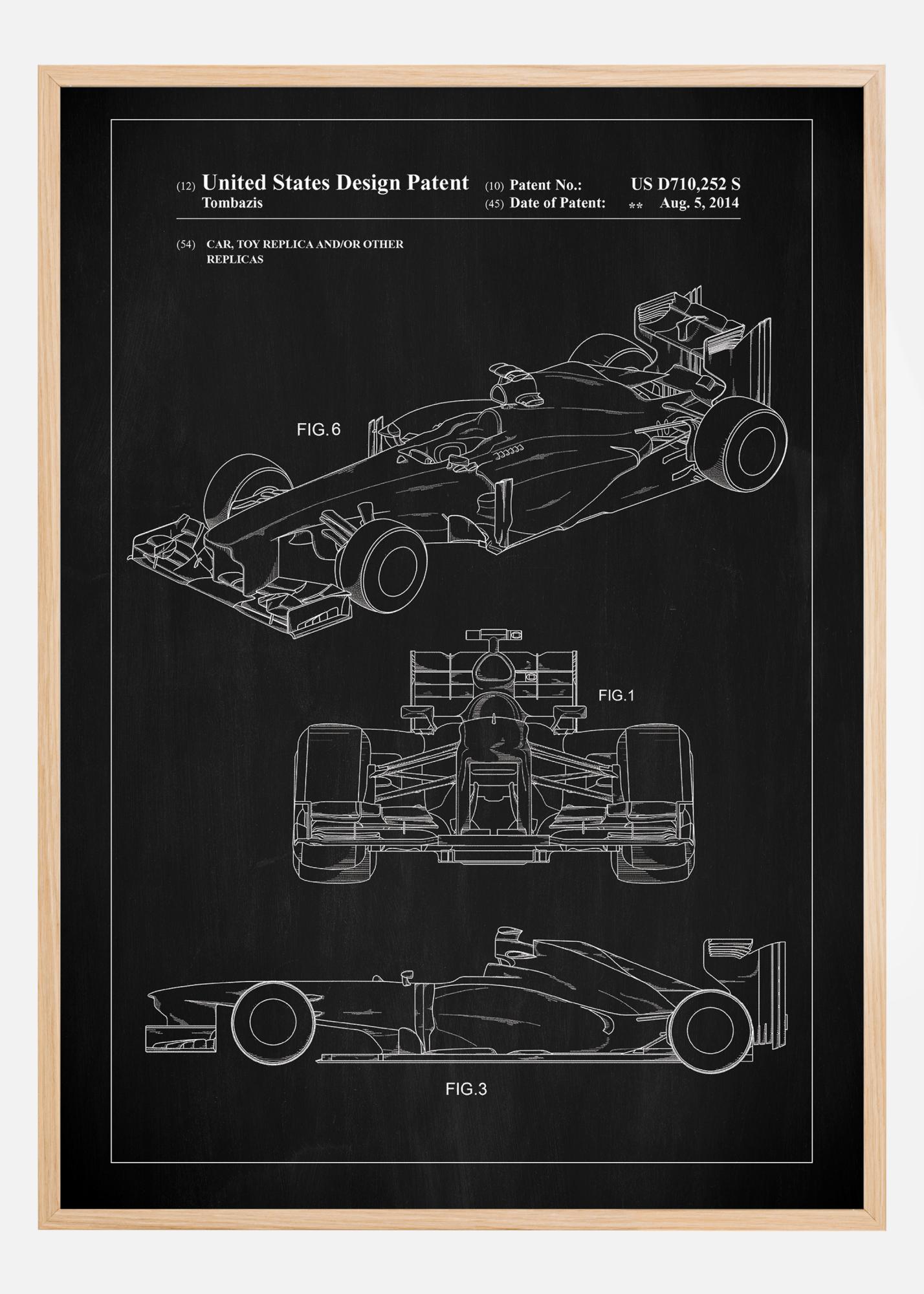 Tento patentový plagát zvýrazňuje elegantný a komplexný dizajn vozidla Formuly 1 podľa amerického dizajnového patentu US D710,252 S, datovaného na 5. augusta 2014. So svojimi charakteristickými čiarami a aerodynamickými tvarmi je navrhnutý z viacerých perspektív, čo poskytuje komplexný obraz jeho ikonického a technicky pokročilého charakteru. Tento dizajn je zásadný pre vysoký výkon a rýchlosť, ktoré sú spojené s pretekmi Formuly 1.