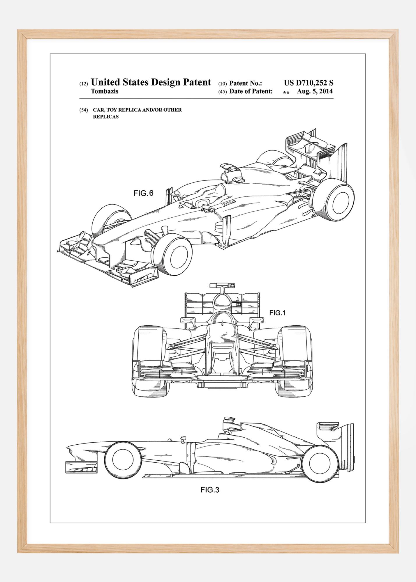 Tento patentový poster zobrazuje dizajn pre pretekárske auto, konkrétne Formulu 1, ktorá je detailne opísaná prostredníctvom amerického dizajnového patentu US D710,252 S, vydaného 5. augusta 2014. Kresba ukazuje auto z viacerých uhlov, aby poskytla úplný pohľad na jeho aerodynamický a inovatívny dizajn. Tento typ dizajnu je kľúčový v motoršporte a prispieva k výkonu a estetike auta.