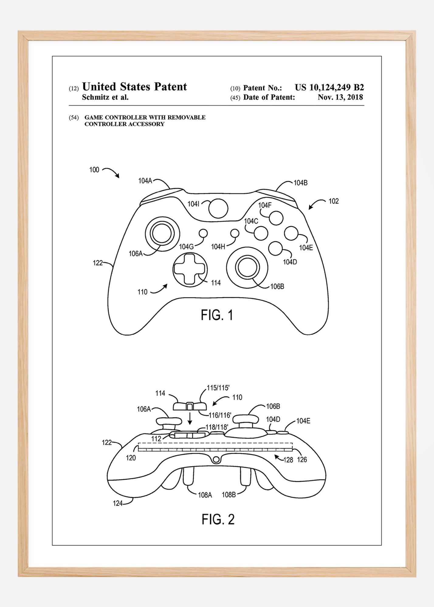 Tento patentový plagát zobrazuje pokročilý herný ovládač pre Xbox s odnímateľným príslušenstvom, patent číslo US 10,124,249 B2, z dátumu 13. novembra 2018. Dizajn, prezentovaný v niekoľkých pohľadoch, odhaľuje vysoký stupeň prispôsobiteľnosti a inovácie v oblasti herného hardvéru, čím poskytuje pohľad na to, ako môže byť interaktivita a hráčska skúsenosť vylepšená prostredníctvom technického dizajnu.