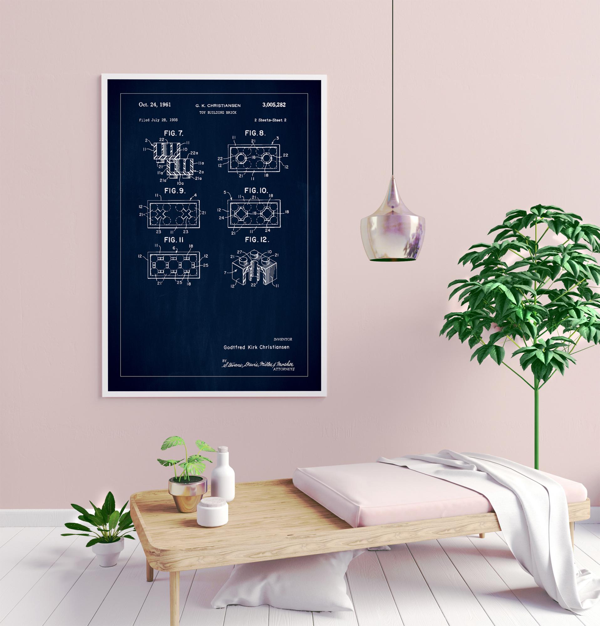 Plagát je starostlivo ilustrovaný detailnými kresbami z pôvodného patentového dokumentu, vrátane rezov a plánov, ktoré zobrazujú jedinečný a revolučný spojovací mechanizmus dizajnu. Bieločiare proti tmavomodrému pozadiu zdôrazňujú inteligentný a nadčasový charakter dizajnu, čím robia tento patentový návrh inšpirujúcim dekoratívnym detailom pre kancelárie, herne alebo ako súčasť zbierky vystavenia. Slúži nielen ako pripomienka radosti z detstva, ale aj ako pripomienka kreatívneho pokroku, ktorý naďalej formuje náš svet.