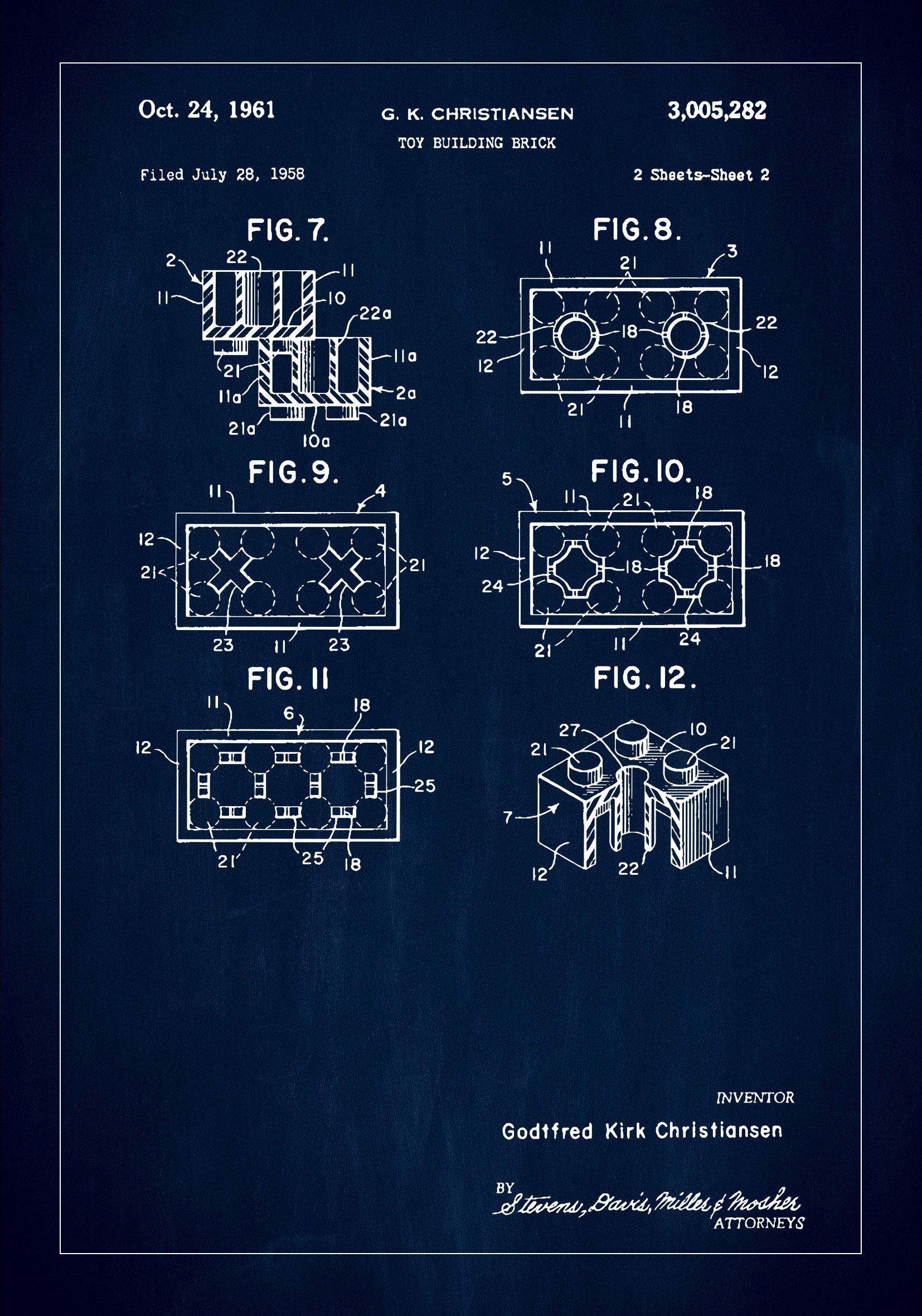 Tento nezabudnuteľný patentový plagát je autentickou reprodukciou patentu pre slávnu hračkársku stavebnú kocku od LEGO, navrhnutú Godtfredom Kirkom Christiansenom, s oficiálnym patentovým číslom 3,005,282. Tento patent, vydaný 24. októbra 1961, predstavuje prelomový bod v dizajne hračiek a získal si zvláštne miesto v srdciach a historických knihách po celom svete.