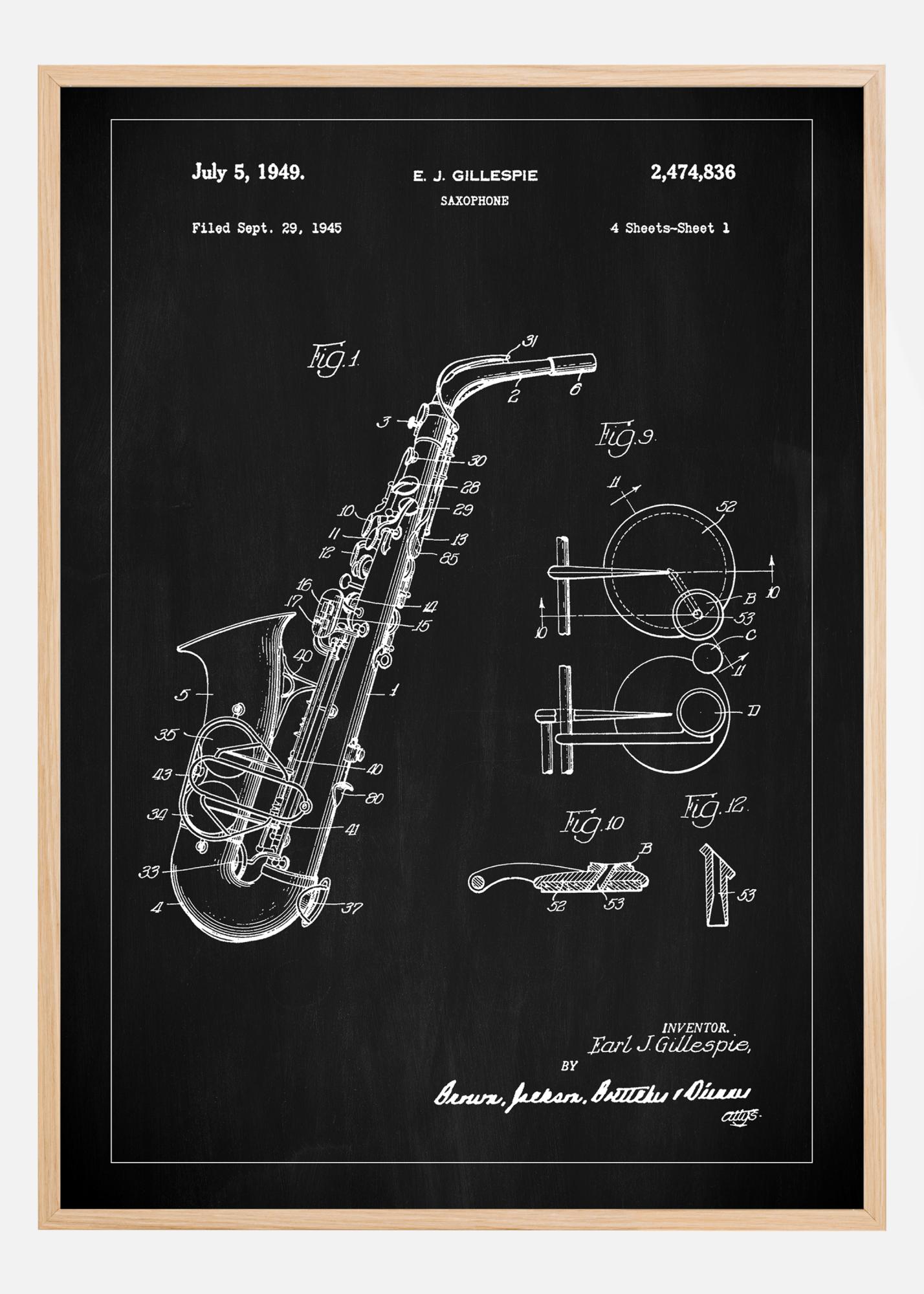 Tento elegantný patentný plagát zvýrazňuje esteticky príťažlivý a komplexný nástroj, ktorým je saxofón, s detailným patentovým výkresom z 5. júla 1949. Každá časť nástroja je jemne ilustrovaná a očíslovaná, čo poskytuje fascinujúci náhľad do jeho mechanickej konštrukcie a dizajnu. Tento jedinečný patentný plagát by bol vynikajúcim prírastkom do interiéru hudobných štúdií, obývačiek alebo kancelárií, kde sa oceňuje hudba a dizajn.