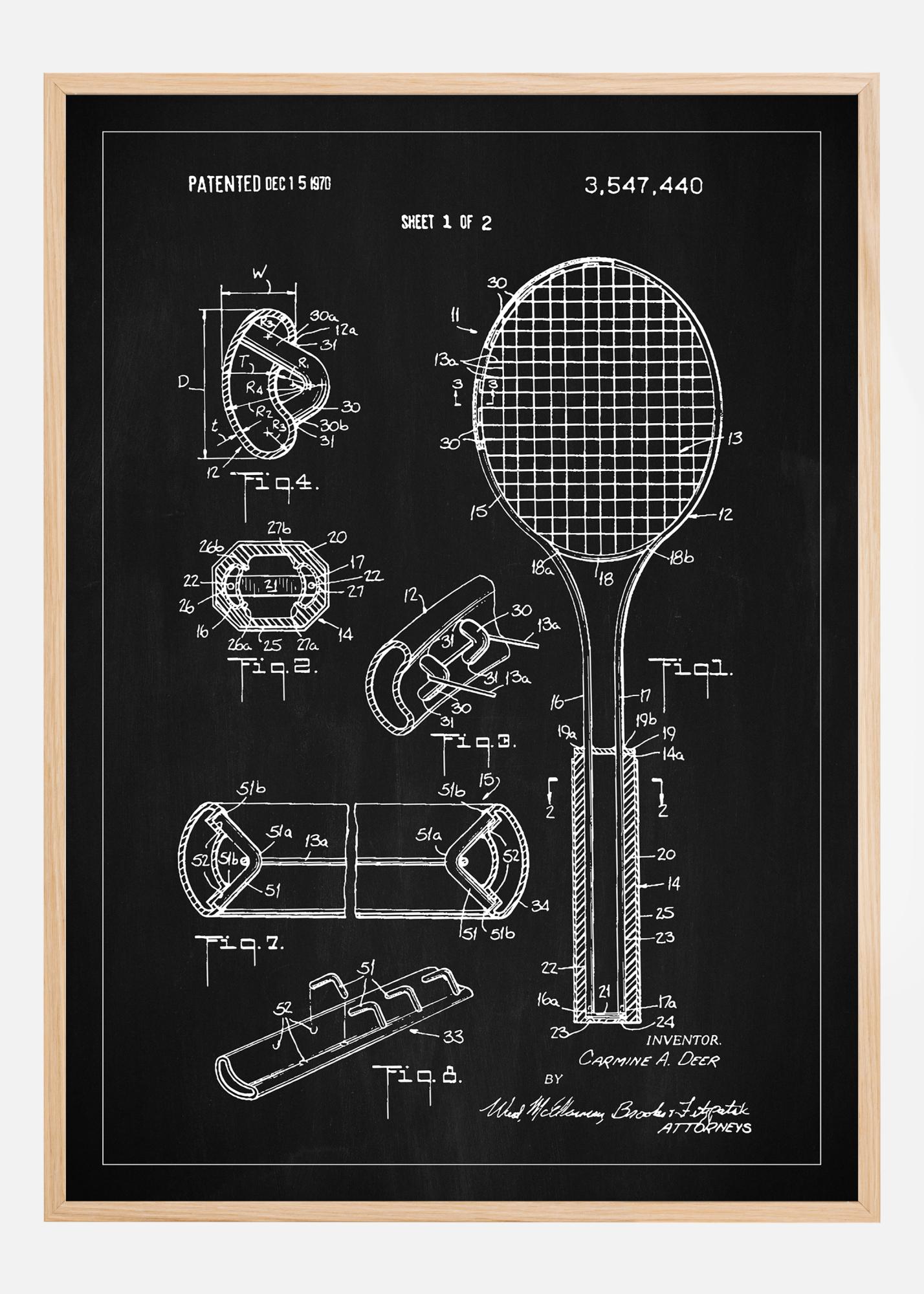 Tento patentový plagát zobrazuje technické ilustrácie z amerického patentu 3,547,440, udeleného 15. decembra 1970. Je to intelektuálny a estetický prínos, ktorý prináša jedinečný charakter do akejkoľvek miestnosti, ideálny pre tenisových nadšencov a milovníkov dizajnu. Klasický čierno-biely vzhľad plagátu zvýrazňuje detailnú konštrukciu tenisovej rakety a príslušných komponentov, ako sú rukoväť a struny, ako aj rôzne perspektívy a sekcie konštrukcie, ktoré sú zobrazené v rôznych obrázkoch.