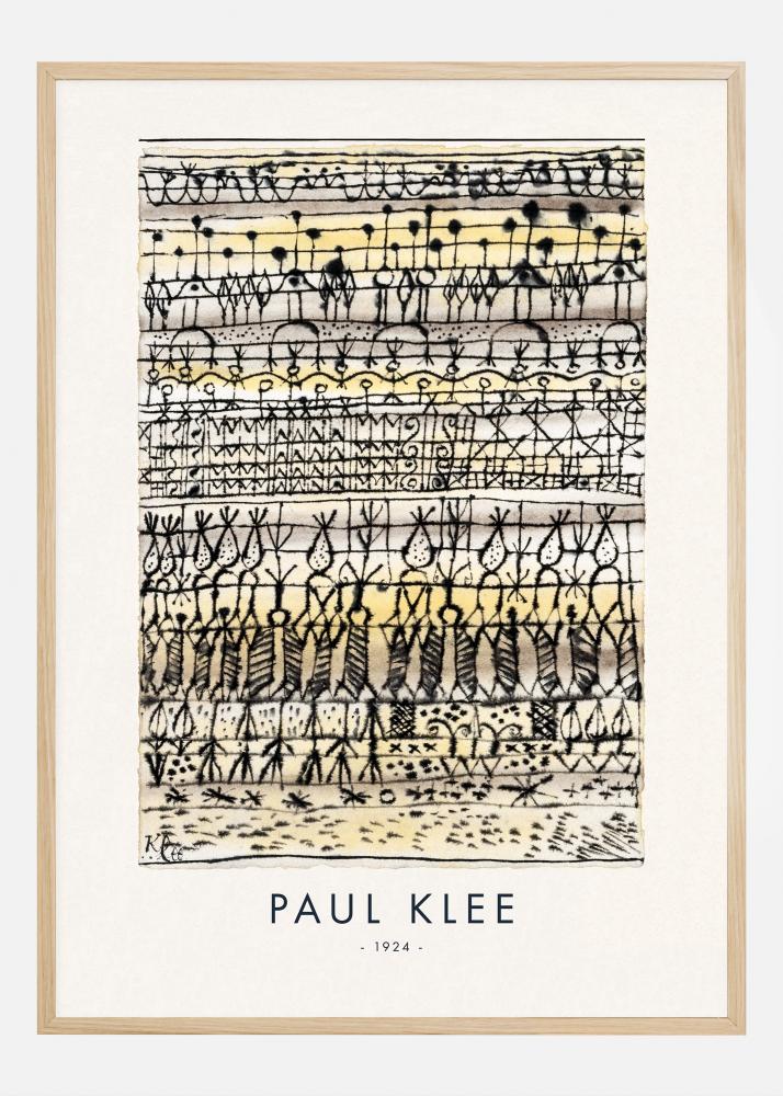 Tento plagát zobrazuje dielo Paula Kleeho "Cooling in a Garden of the Hot Zone" z roku 1924, komplexný vzor čiar a tvarov pripomínajúci záhradu v abstraktnej krajine. Hravo Klee skúma témy prírody a štruktúry vrstvením symbolických a geometrických prvkov na seba, čím vytvára rytmickú a takmer hudobnú kompozíciu. Rôznorodé použitie typov čiar a kontrastných farieb vdychuje život abstraktnej záhrade spôsobom typickým pre Kleeho umenie.
