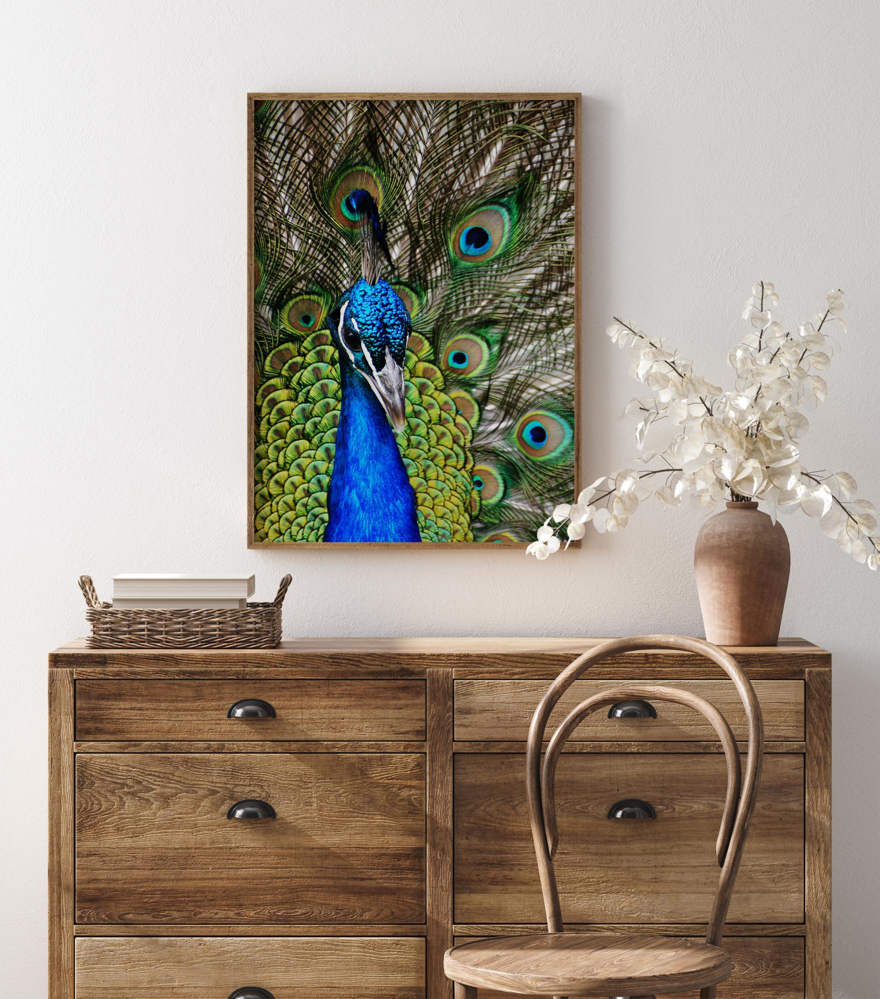 Úžasný detailný plagát s pávom. So svojimi veľkými farebnými chvostovými perami a očným vzorom táto farebná bytosť žiari v prirodzenom slnečnom svetle. Vneste krásu vtáka do svojho domova pomocou tohto dokonalého plagátu.