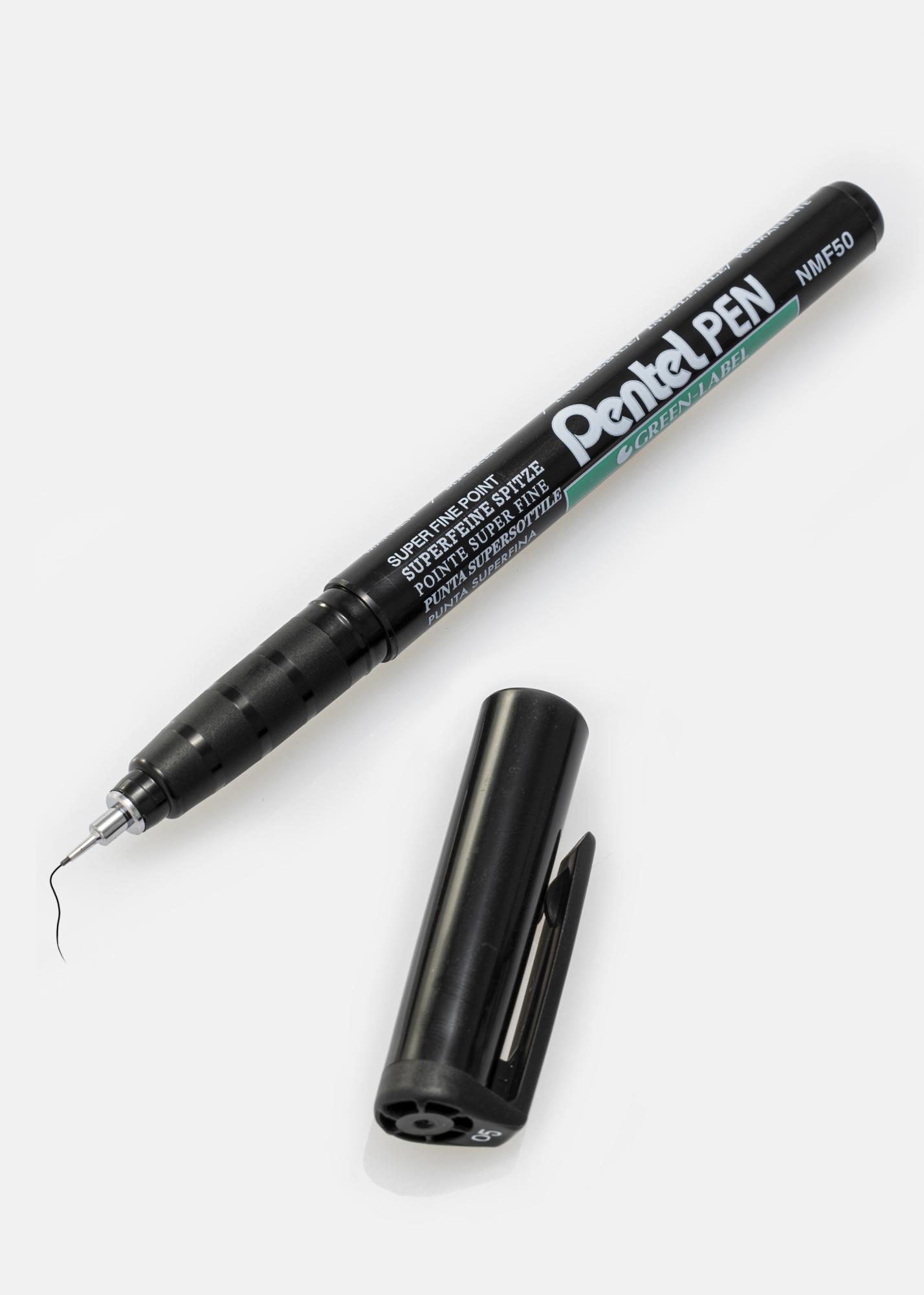 Tenké čierne pero od Pentel so šírkou hrotu 0,5 mm, ktoré pôsobí elegantne.