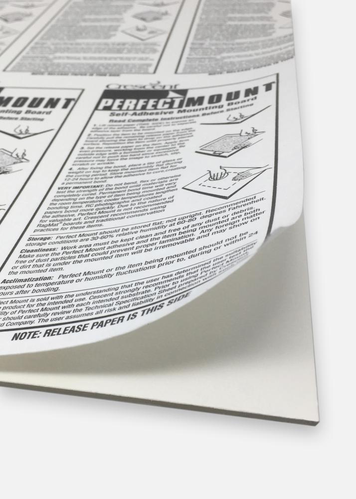 Perfect Mount je 1,4 milimetra hrubý montážny panel s obojstranným lepidlom na montáž obrázkov a fotografií. Panel je samozrejme bez kyselín a pH neutrálne, aby sa zabezpečilo čo najlepšie uchovanie vašich obrázkov. Lepidlo na paneli je aktivované tlakom, čo znamená, že môžete obrázok umiestniť a odstrániť, kým nebudete spokojní. Na odstránenie prípadných bublín môžete prejsť po povrchu obrázka jemnou handričkou alebo bavlnenou rukavicou, od stredu smerom von. Panel sa potom položí pod tlak na trvalé pripevnenie obrázka.