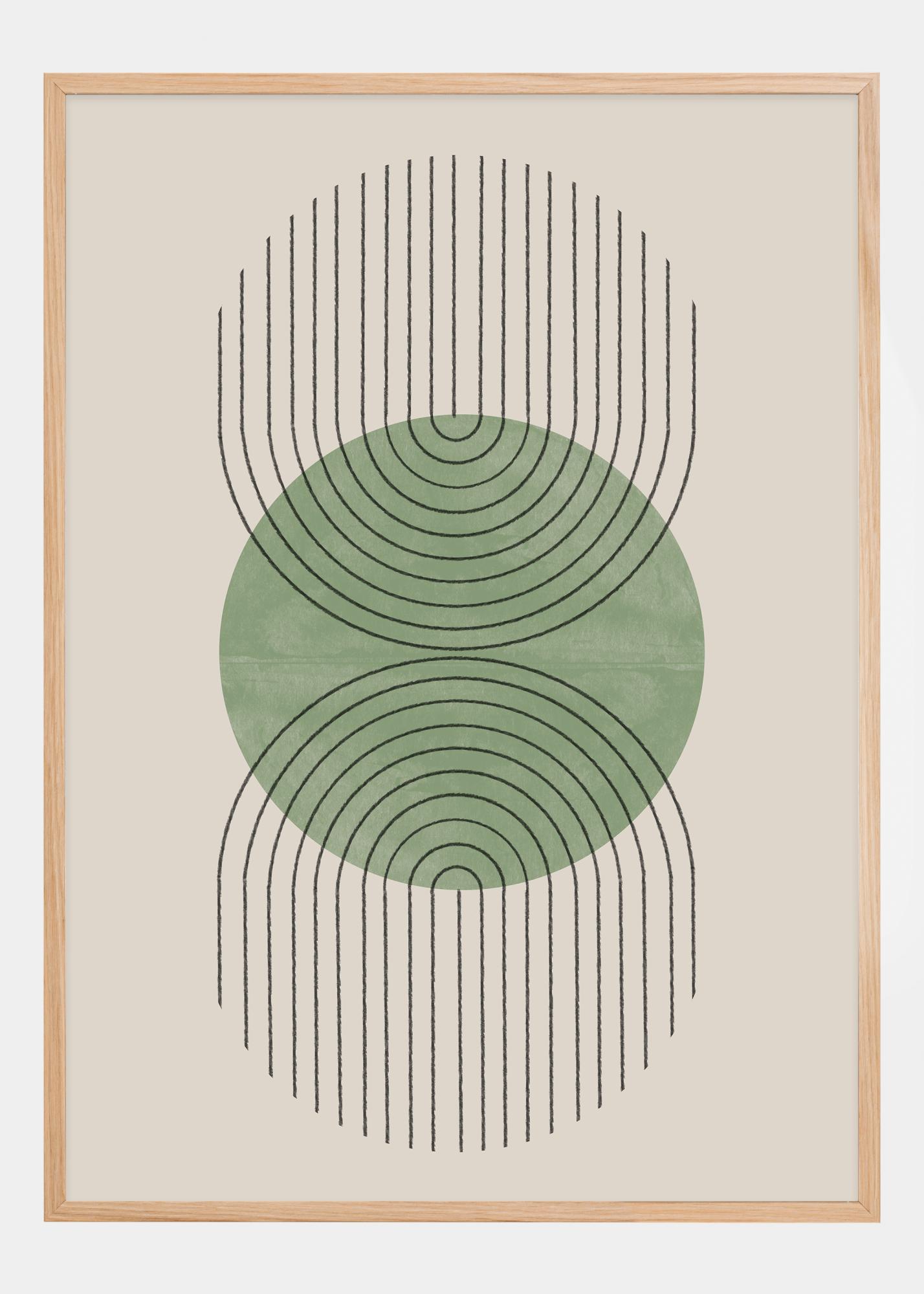 Tento plagát je minimalistické umelecké dielo, ktoré zvýrazňuje sýtu zelenú kruhovú formu obklopenú sériou čiernych čiar, čím vytvára pocit priestoru a hĺbky. Zelený odtieň v kruhu sa mení v intenzite, čo vytvára vizuálny efekt dimenzie a textúry. Čiary, ktoré sa rozprestierajú smerom von od okraja kruhu, vytvárajú takmer hypnotický efekt a predstavujú geometrickú harmóniu.