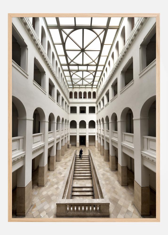 Veľkolepý plagát s budovou Petra Behrensa. Béžový a biely interiér zachytáva postavu, ktorá stúpa po schodoch. Priehľadná strecha osvetľuje detaily architektúry s kruhovými a štvorcovými oknami, ktoré prepúšťajú svetlo. Vytvorte štýlovú atmosféru s touto úžasnou tlačou.