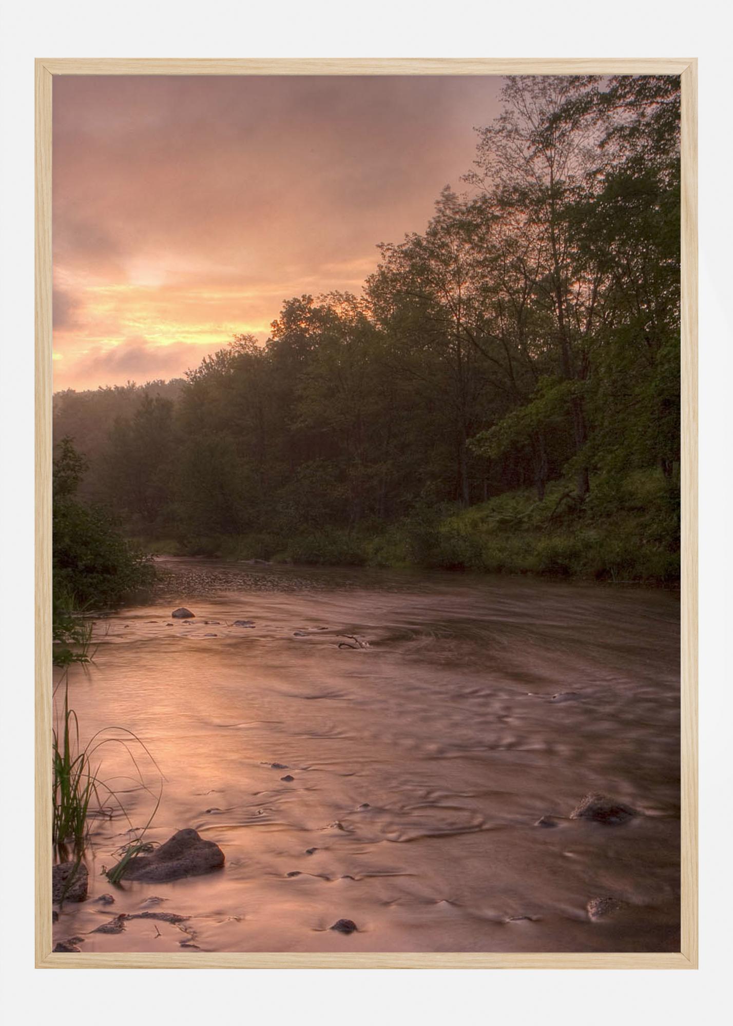 Úžasná tlač bahnitej rieky, ktorá tečie cez les. Oranžové večerné slnko klesá cez oblaky a dodáva obrázku nenápadný oranžový nádych. Zaveste tento magický plagát do obývačky a nechajte sa unášať prúdom.