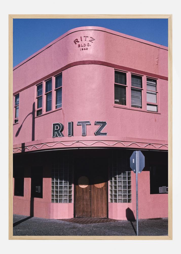 Pestrý plagát s ružovou dvojpodlažnou budovou Ritz. Tmavomodrá obloha zvýrazňuje tmavoružovú budovu a tmavohnedé vchodové dvere. Slnečné svetlo odráža tieň lampáša a pouličnej značky na fasáde budovy. Perfektná tlač pre všetkých, ktorí milujú 40. roky 20. storočia.