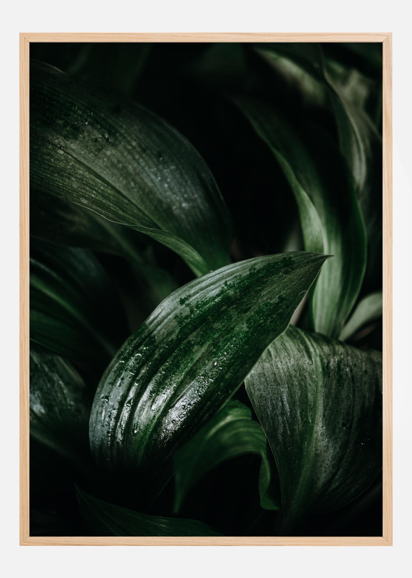 Detailný pohľad na mokré listy, ktoré tesne spolu pokrývajú plagát. Kvapôčky vody na listoch vytvárajú lesklú atmosféru. Tmavé, rozmazané pozadie zobrazuje iné listy, ktoré sa snažia byť viditeľné. Táto dokonalá krása je ideálna pre váš domov.