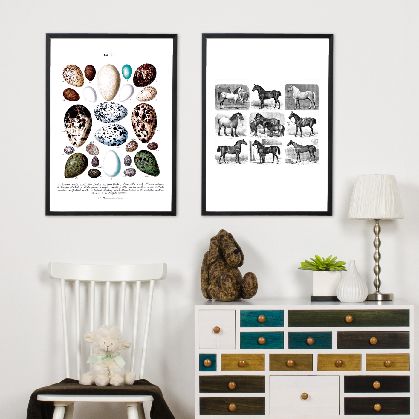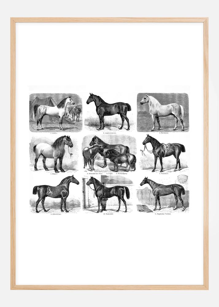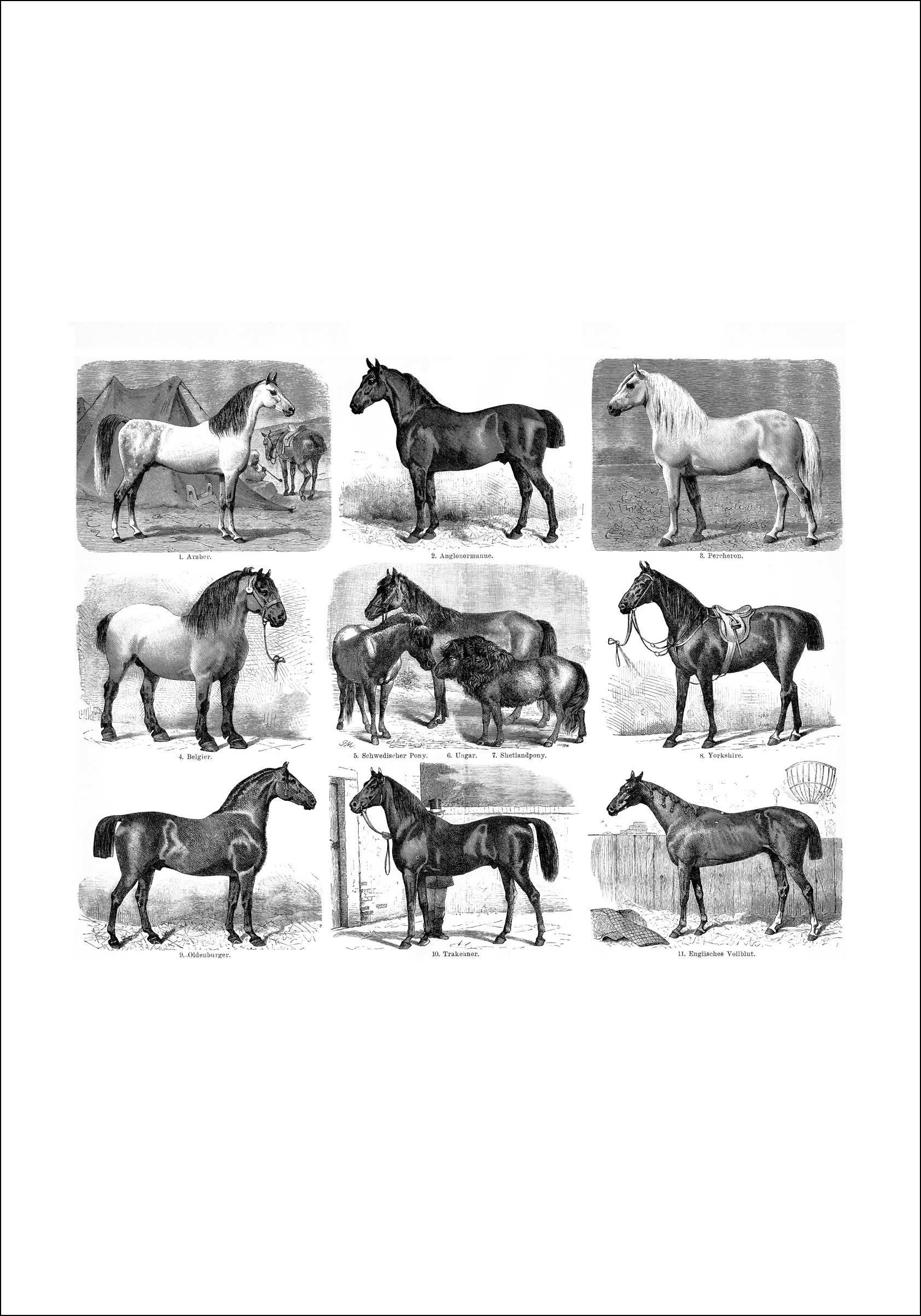 Ak nemôžete mať dosť koní, máme tu krásny plagát s motívom rôznych plemien koní. Pod každým obrázkom nájdete názov plemien napísaný po anglicky. Keďže je plagát čiernobiely, jednoducho ho môžete skombinovať s rámom v peknej farbe. Plagát je dostupný v niekoľkých rôznych veľkostiach, ktoré môžete postaviť na komodu alebo zavesiť na stenu.