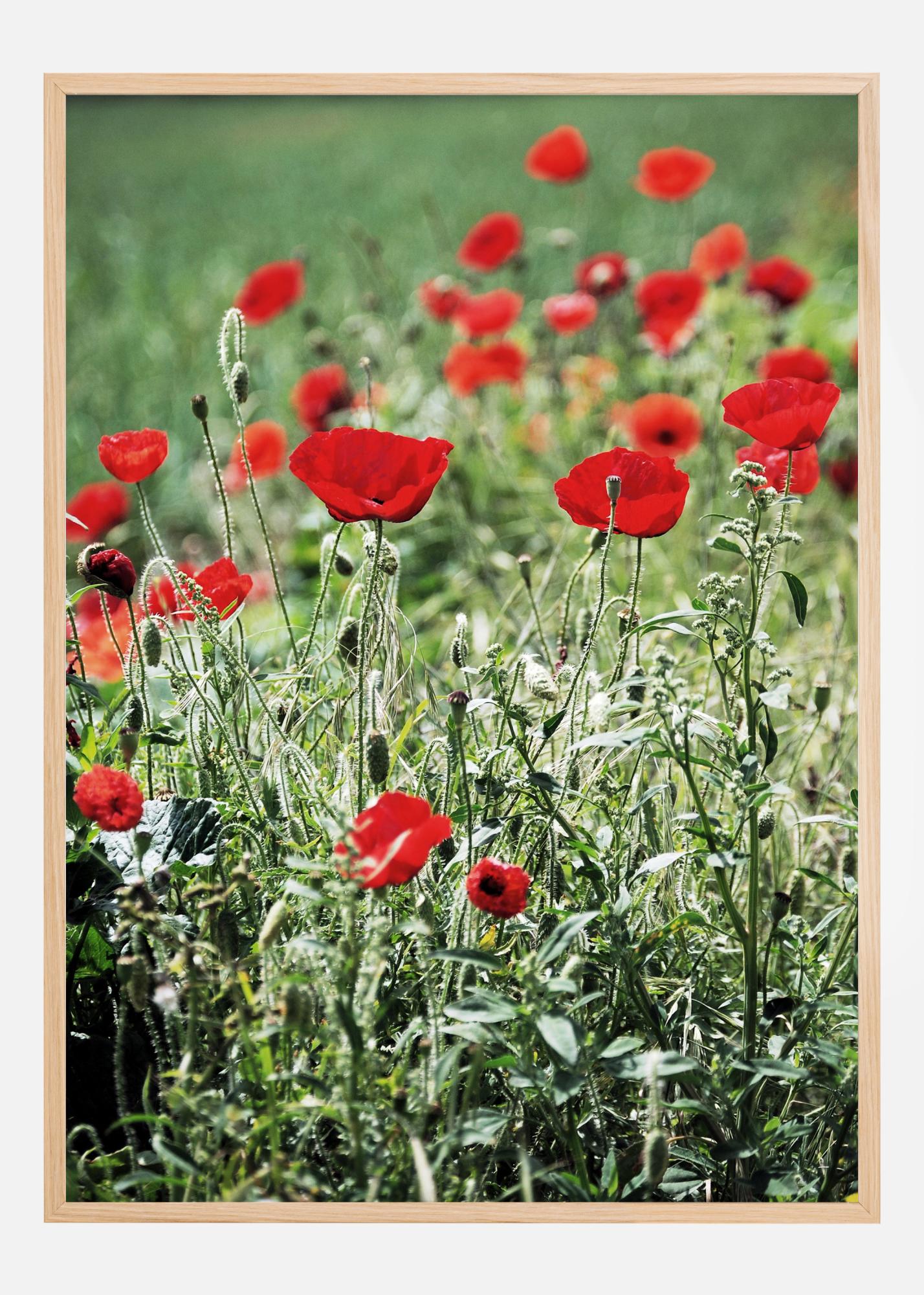 Krásny detailný výtlačok makového poľa. Tmavozelená tráva zdôrazňuje farebnosť makových kvetov a vytvára svieži pocit. Makové kvety stoja vzpriamene na poli, zatiaľ čo tráva rastie okolo nich. Uvoľňujúci a krásny plagát na zavesenie do vašej spálne.