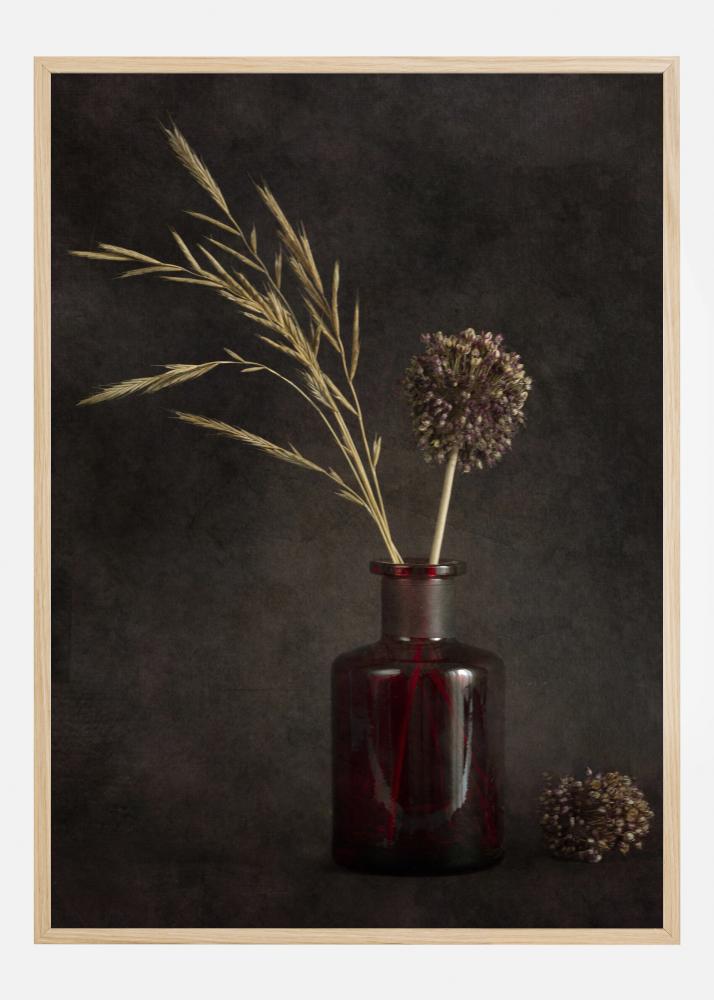 Krásna, ale jednoduchá potlač dvoch sušených tráv v sklenenej nádobe. Na tmavohnedom pozadí sú umiestnené nažltlé trávy v červenohnedej nádobe. Napravo od vázy leží ďalšia sušená tráva. Krásny plagát, ktorý pridá trochu farby na bielu stenu.