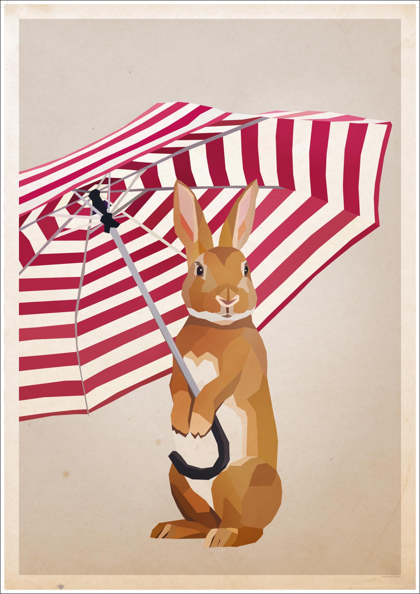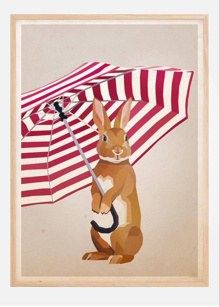 Roztomilé umelecké dielo so zajacom držiacim dáždnik medzi prednými labkami. Na béžovom pozadí drží hnedo-biely zajac červený a biely dáždnik. S očami zajaca, ktoré sa priamo pozerajú do kamery, je to perfektný plagát pre detskú izbu.