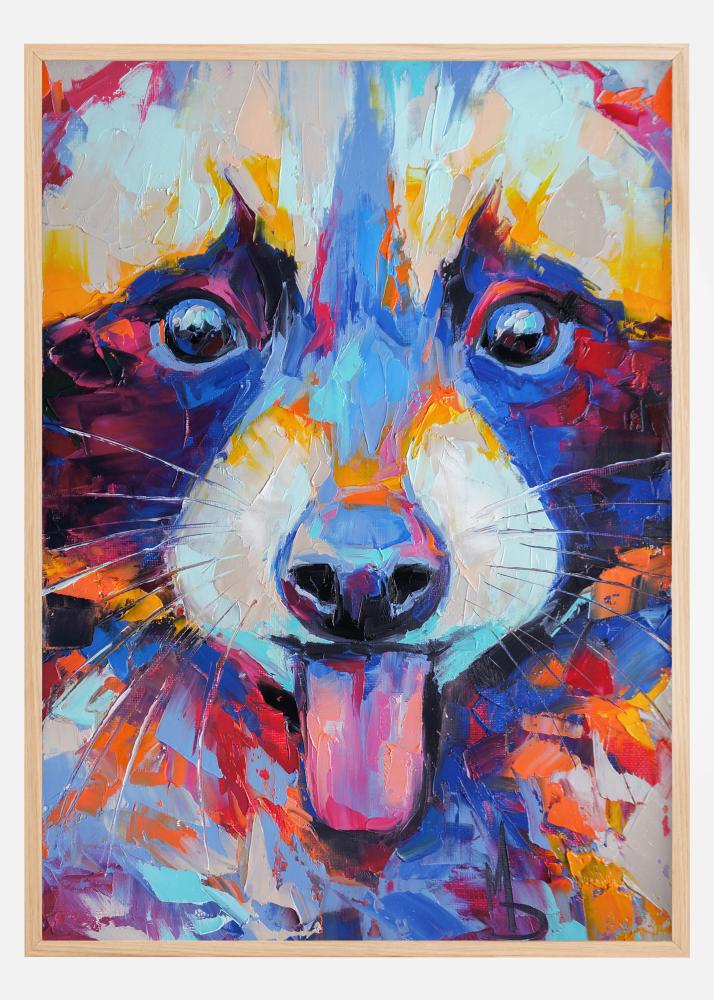 Viacfarebný portrétový plagát medvedíka čistotného. Dobre zmiešané farby poskytujú dokonalý obraz jeho nebesky modrých očí, tmavého nosa, ružového jazyka a čiernobielych fúzov. Priblížený obrázok s umelcovým podpisom vľavo dole najlepšie zapadne do obývačky alebo spálne milovníka zvierat.