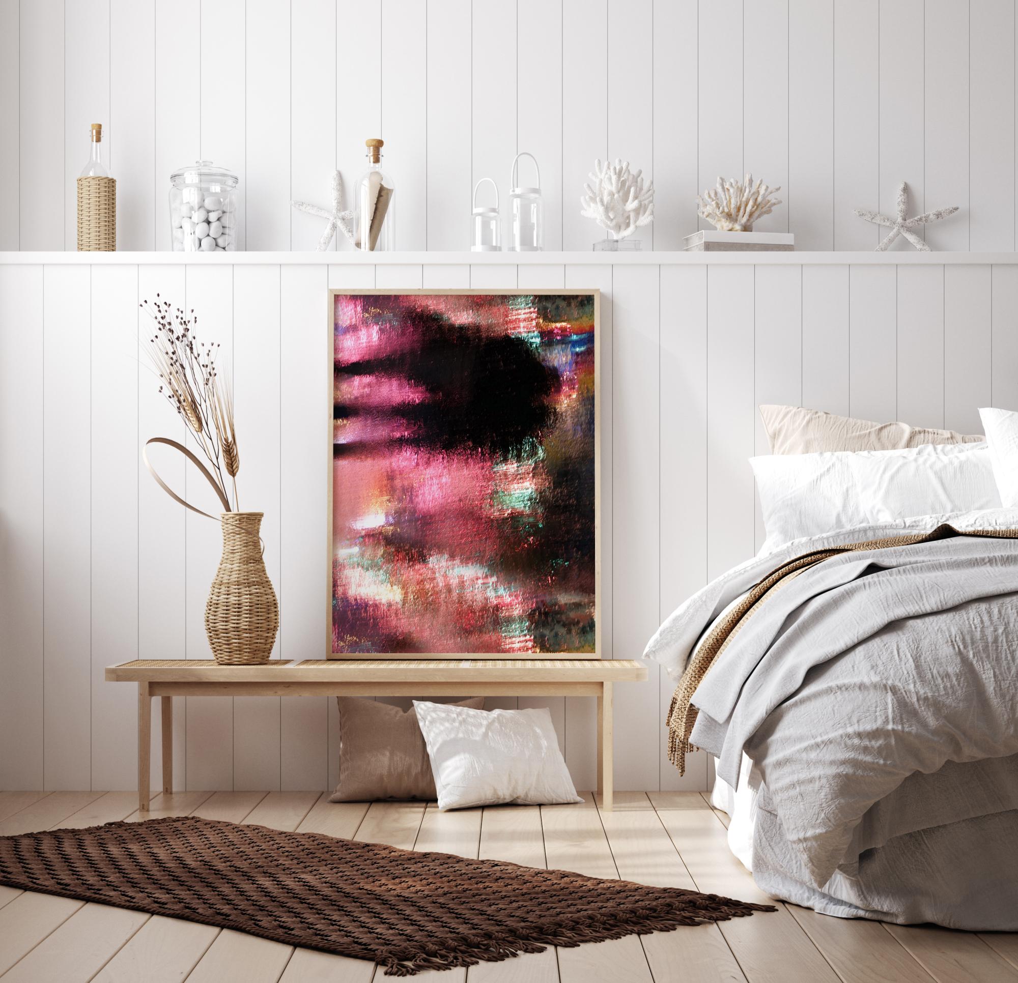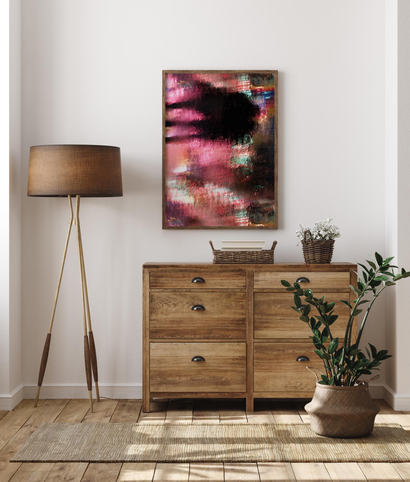 Dokonalá zmes farieb s ružovými tónmi dominuje tejto viacfarebnej tlači. Na vrchu tlače je čierna oblasť, ktorá vytvára pocit hĺbky. Napravo od čiernej oblasti sa nachádza vertikálna rúrková forma v červenej a zelenej. Dokonalý plagát na pridanie farebného dotyku k neutrálnej stene.