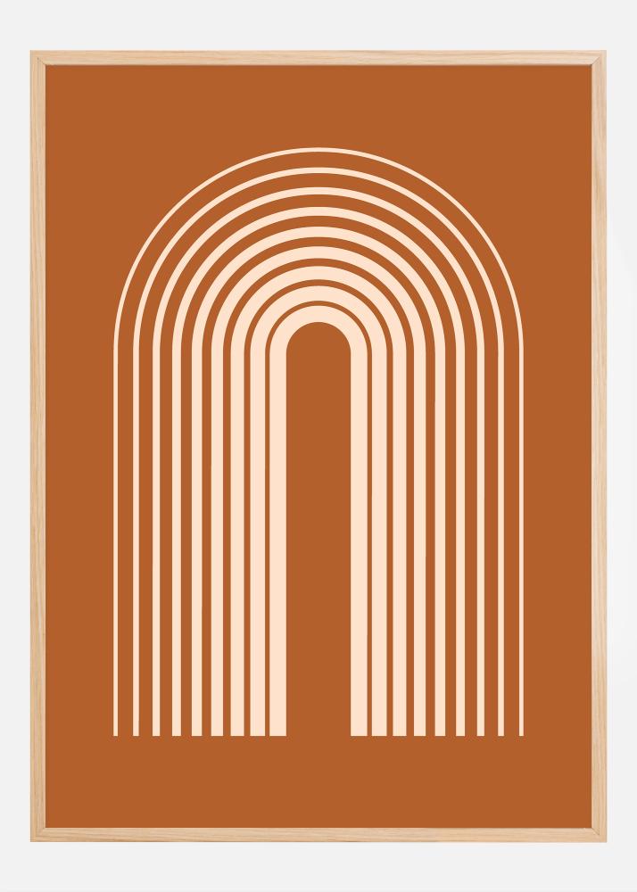 Tento plagát s abstraktným vzorom poloblúka je poctou modernej umeniu a dizajnu. Vzor sa javí ako séria dokonale symetrických oblúkov v teplých, tonálnych farbách, ktoré poskytujú upokojujúci a rytmický vizuálny výraz. Stabilne tmavšie terakotové pozadie ponúka hlbokú a bohatú krajinu pre svetlejšie línie, ktoré vystupujú v popredí, a vytvára dynamický kontrast, ktorý zaujme pohľad.