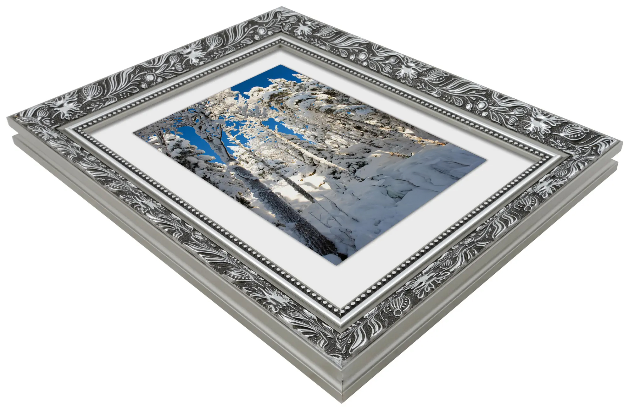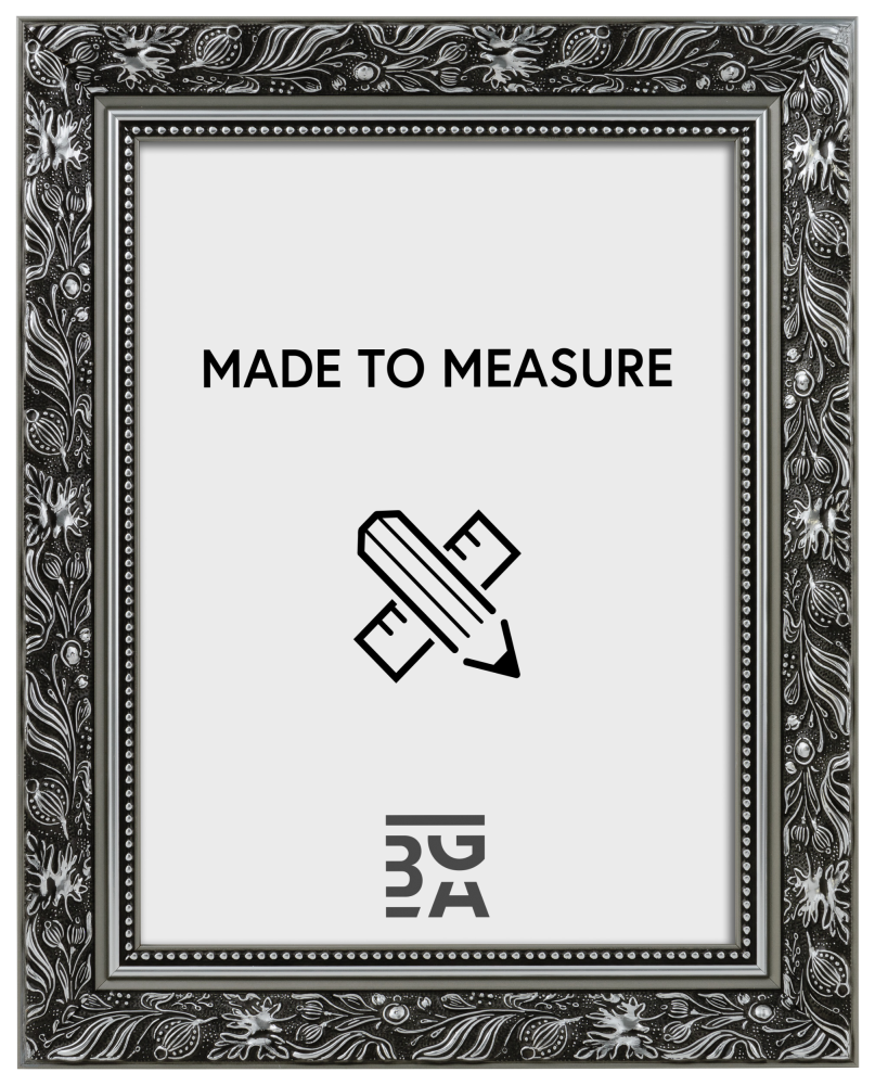 Urobte stenu luxusnou a zároveň pritiahnete pozornosť na váš obraz! Tento krásny rám má dvojitý profil, ktorý na stene vyzerá veľmi pekne. Hrany sú úplne strieborné, zatiaľ čo predná strana je čierna a má strieborný vzor s listami a ozdobnými tvarmi. Najbližšie k sklu vedie strieborný okraj a čierna časť s perlovým vzorom v striebornej farbe. Pretože rám sa vyrába podľa vašich rozmerov, môžete si byť istí, že bude presne tam, kde ho chcete mať.