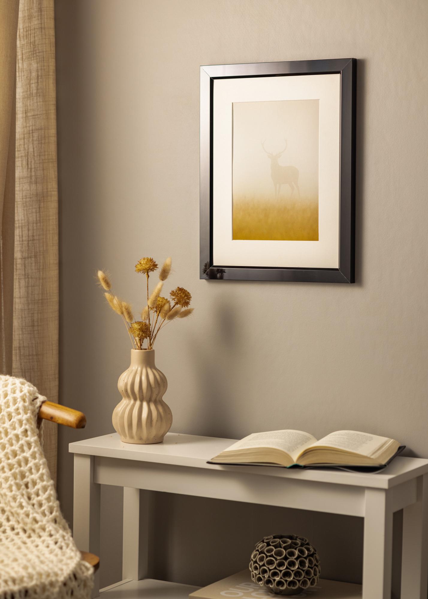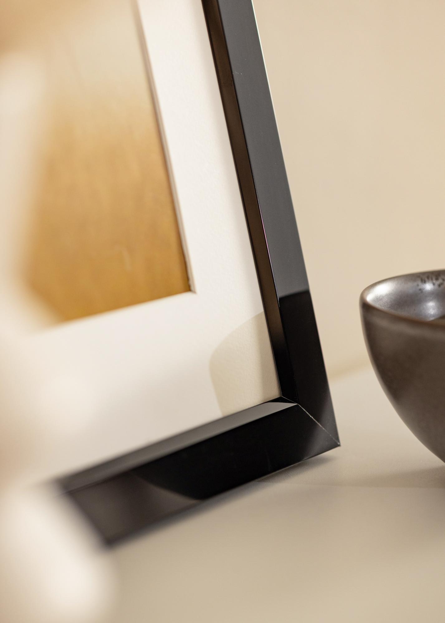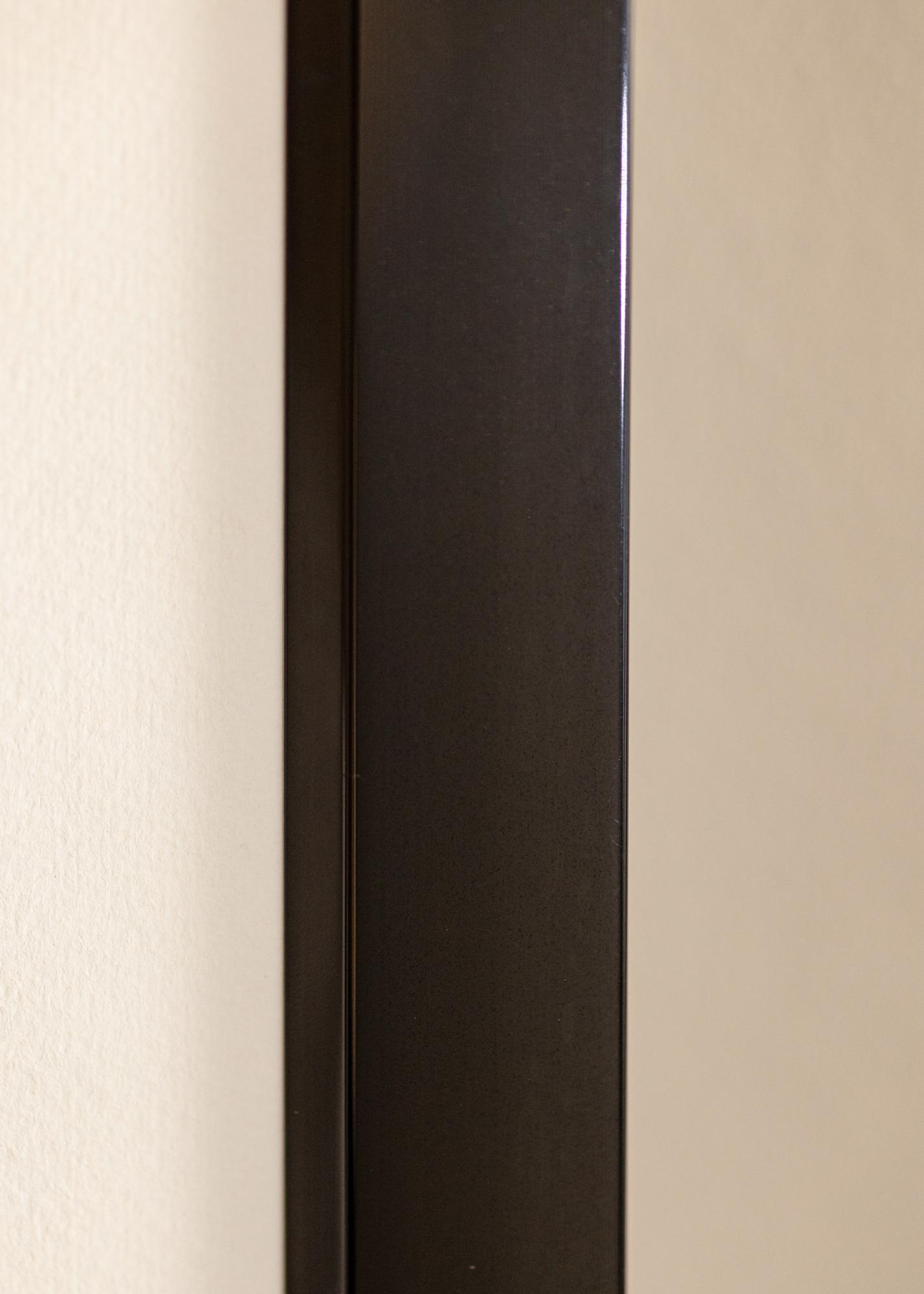 Čierny štýlový vysokolesklý rám na obrázky, vyrobený z hliníka, ktorý má zreteľné vnútorné skosenie. Rám sa hodí použiť na všetko od fotografických portrétov až po krajinomaľby v akvareli a s bielym passepartout sa motív ešte viac zvýrazní. Lesklý lak umožňuje, aby rám na obrazy obzvlášť dobre zapadol do moderných industriálnych interiérov a iných minimalistických štýlov. Skombinujte s inými čiernymi rámami na obrazy, aby ste miestnosti dodali pocit jednotnosti.
