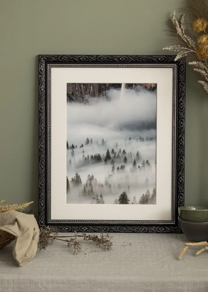 Barock Čierna je nádherný drevený rám v retro štýle s krásnymi ozdobami a prvkami striebra najbližšie k motívu. Perfektné, keď hľadáte široký krásny drevený rám v staromódnom štýle. Skvelá voľba pre zväčšeniny, ktoré máte obzvlášť radi.
