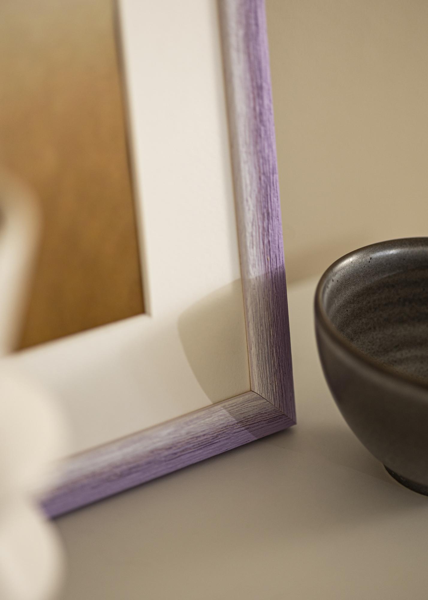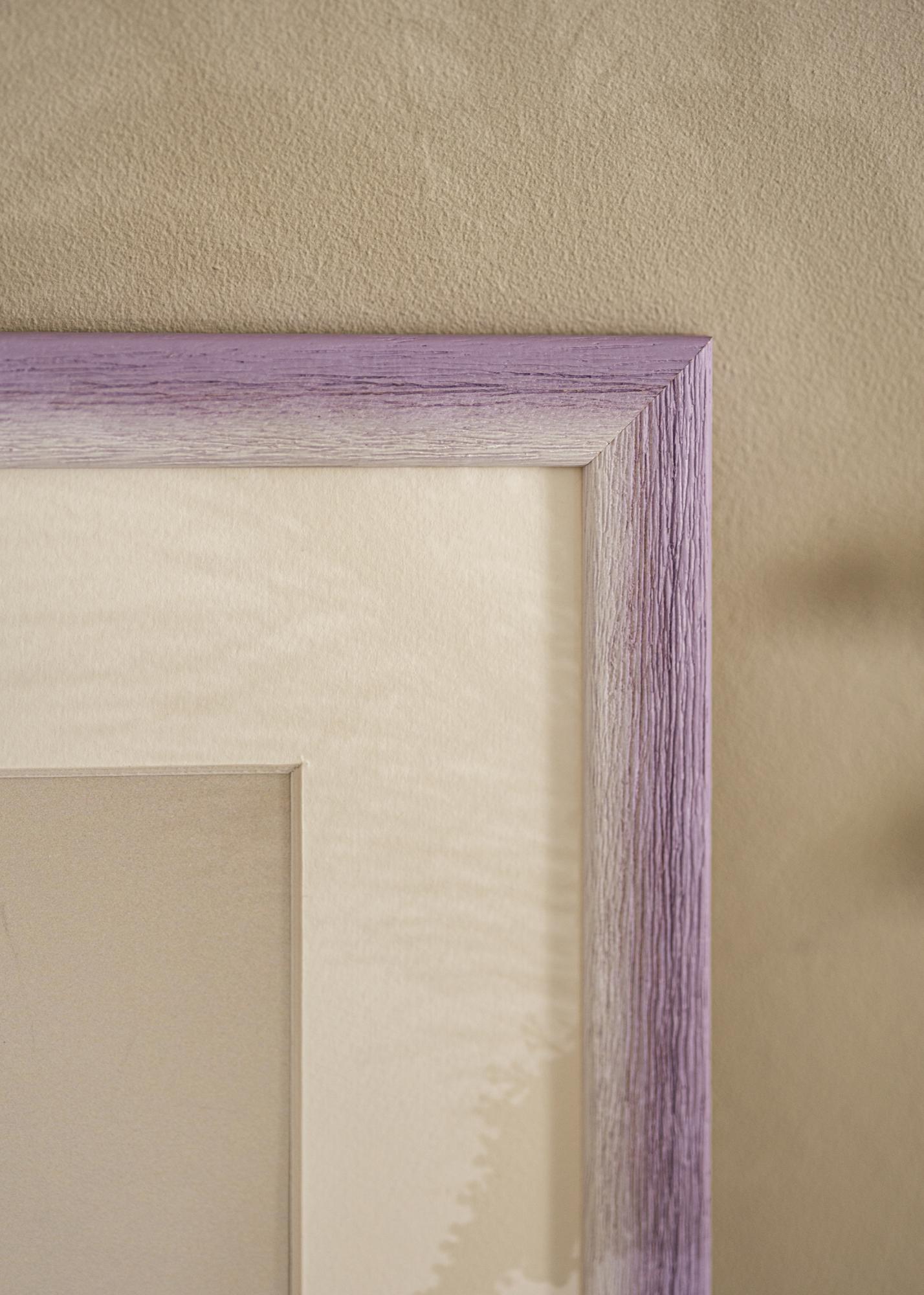 Rám je vyrobený z dreva Ayous a má jemný prechod farieb z takmer kostnej bielej na jemný levanduľovo-lila odtieň. Výrazná štruktúra dreva s vertikálnymi žilami dodáva prirodzený a rustikálny pocit, zatiaľ čo ručne maľovaný efekt vytvára jemnú a živú hĺbku vo farebnej schéme. Povrch má matný povrch, ktorý umocňuje harmonickú a pokojnú farebnú paletu.
