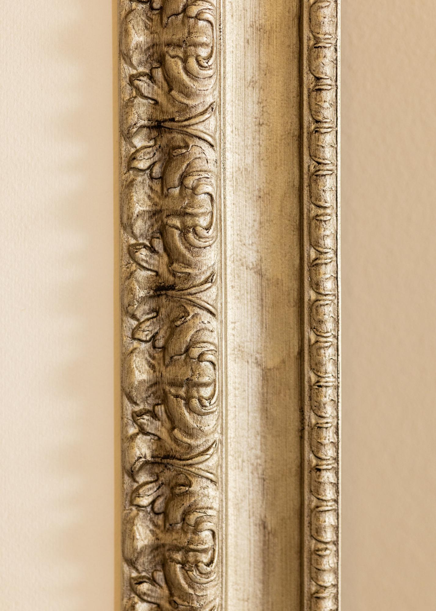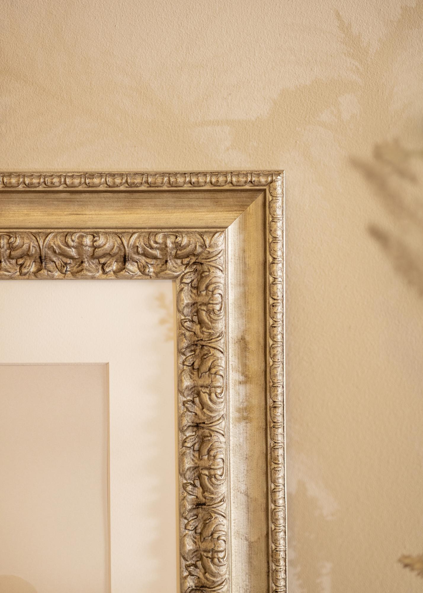 Táto na mieru vyrobený rám obrazu je vyrobený z dreva a má antický zlatý tón s ľahko patinovaným povrchom. To posilňuje klasický pocit a robí rám ideálnym pre moderné aj tradičné interiéry. Detailné ornamenty v reliéfe pozdĺž vnútornej hrany dodávajú sofistikovaný výrazu, zatiaľ čo kartáčovaný povrch zdôrazňuje hĺbku dekoru a vytvára jemný zostarnutý efekt.