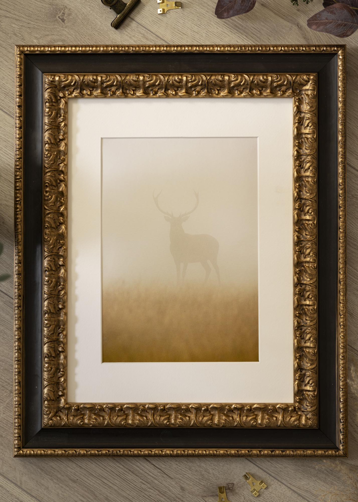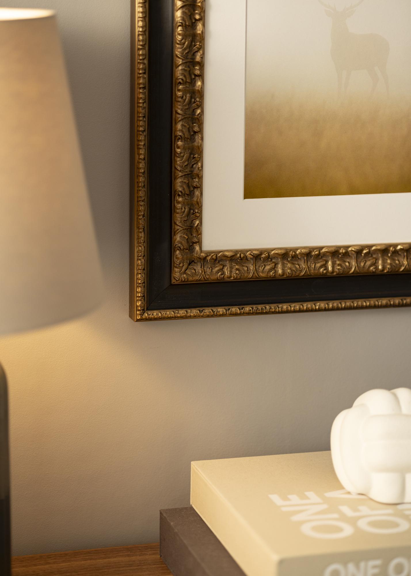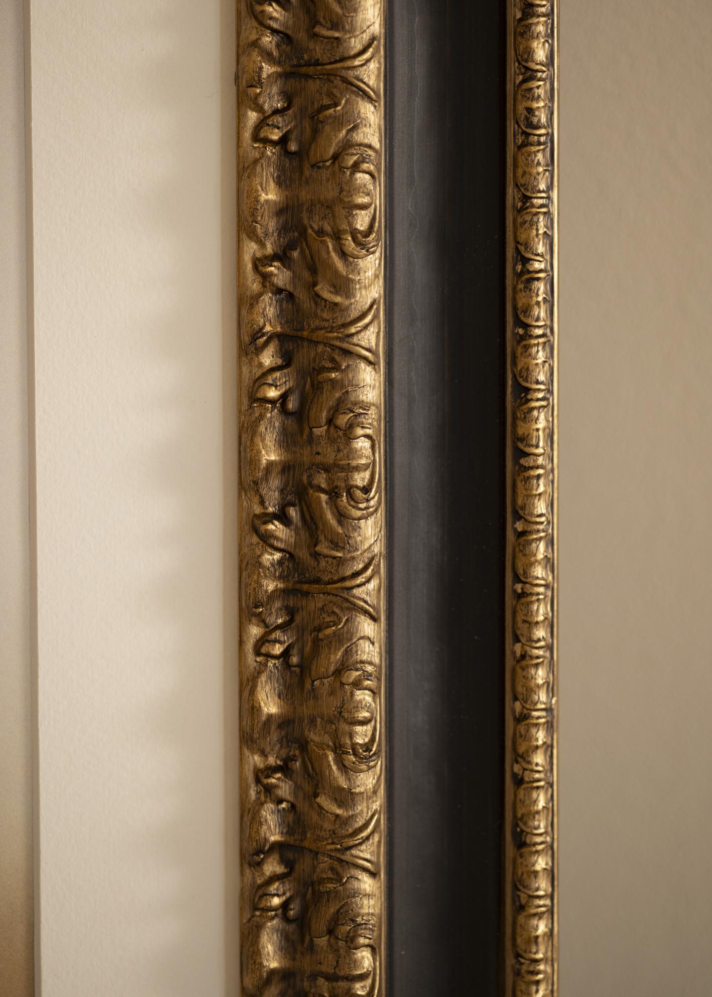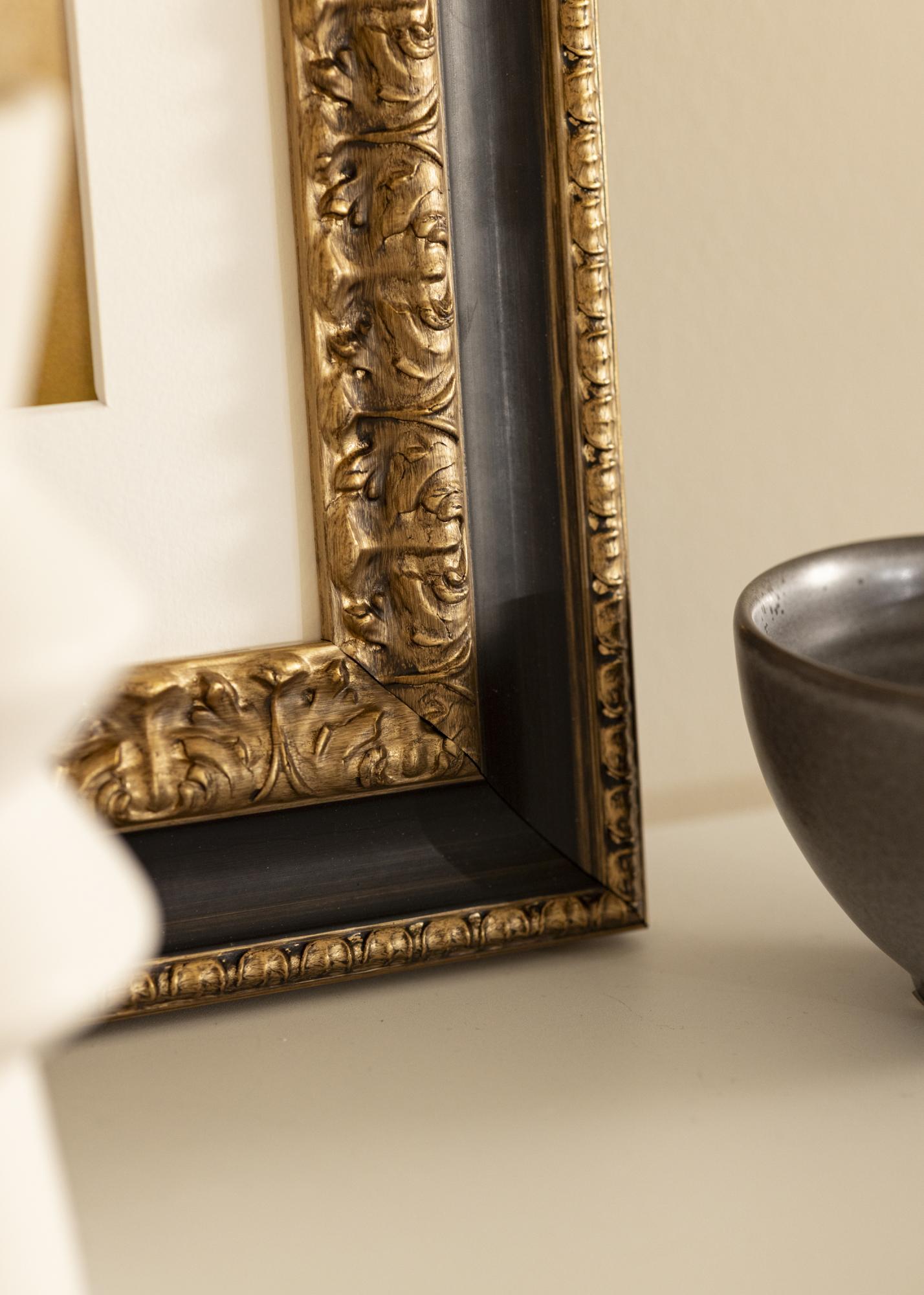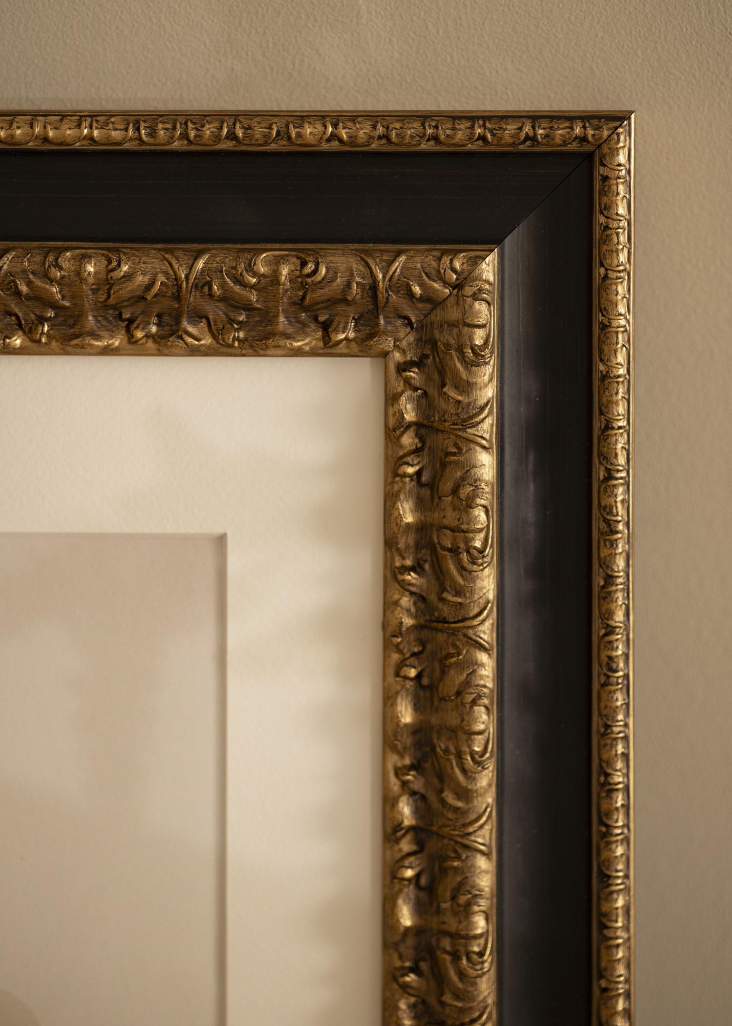 "Drottningholm Guld" je krásny retro rám z Talianska z prstovanej borovice, ktorý je ručne maľovaný. Rám má bohato zdobený zlatý profil so širokým čiernym okrajom, ktorý dodáva rámu elegantný pocit. Perfektný na všetky typy rámovania v retro štýle.