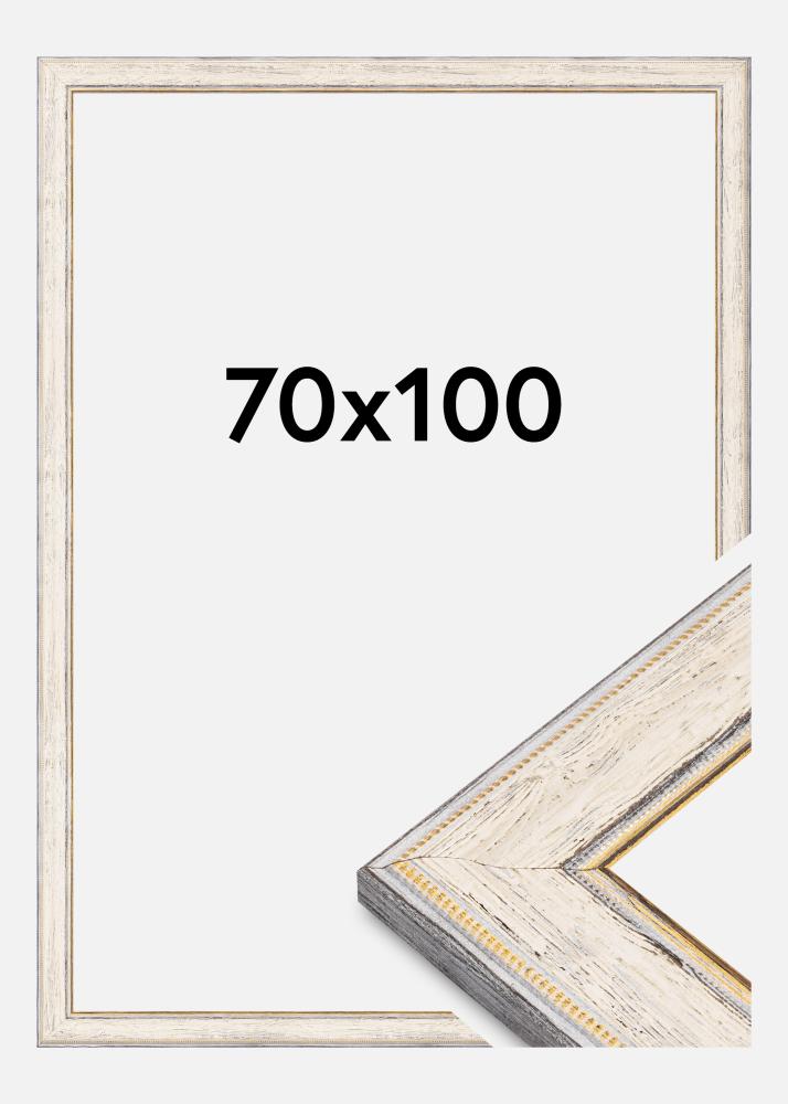 Táto krásny rám je dokonalou kombináciou vintage inšpirácie a modernej elegancie. So svojím rustikálnym bielym a sivým dreveným povrchom, doplnený jemnými zlatými detailmi pozdĺž vnútornej hrany, ponúka očarujúci starožitný vzhľad. Rám je navrhnutý tak, aby bol vhodný pre motívy vo veľkosti 70x100 cm, čo ho robí ideálnym na zvýraznenie vašich obľúbených fotografií alebo umeleckých diel s nadčasovým a sofistikovaným pocitom.