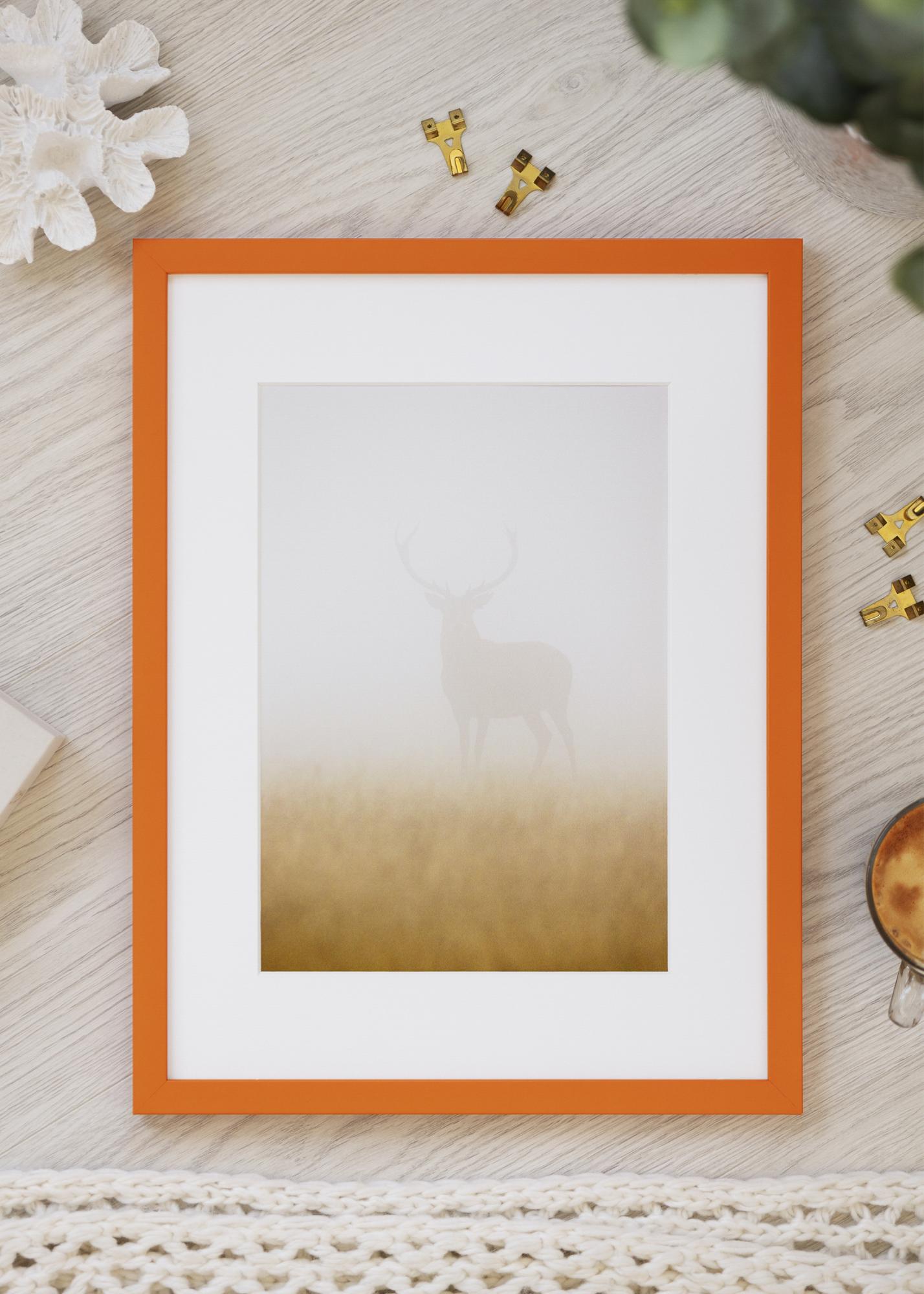 Rám má úzky profil s rámovou lištou širokou aj hlbokou 17 mm, čo vytvára čistý a grafický vzhľad. Hladký, lesklý povrch v jasnom oranžovom odtieni necháva motív vyniknúť, zatiaľ čo presné rohy a rovnomerná povrchová úprava dodávajú elegantný dojem.