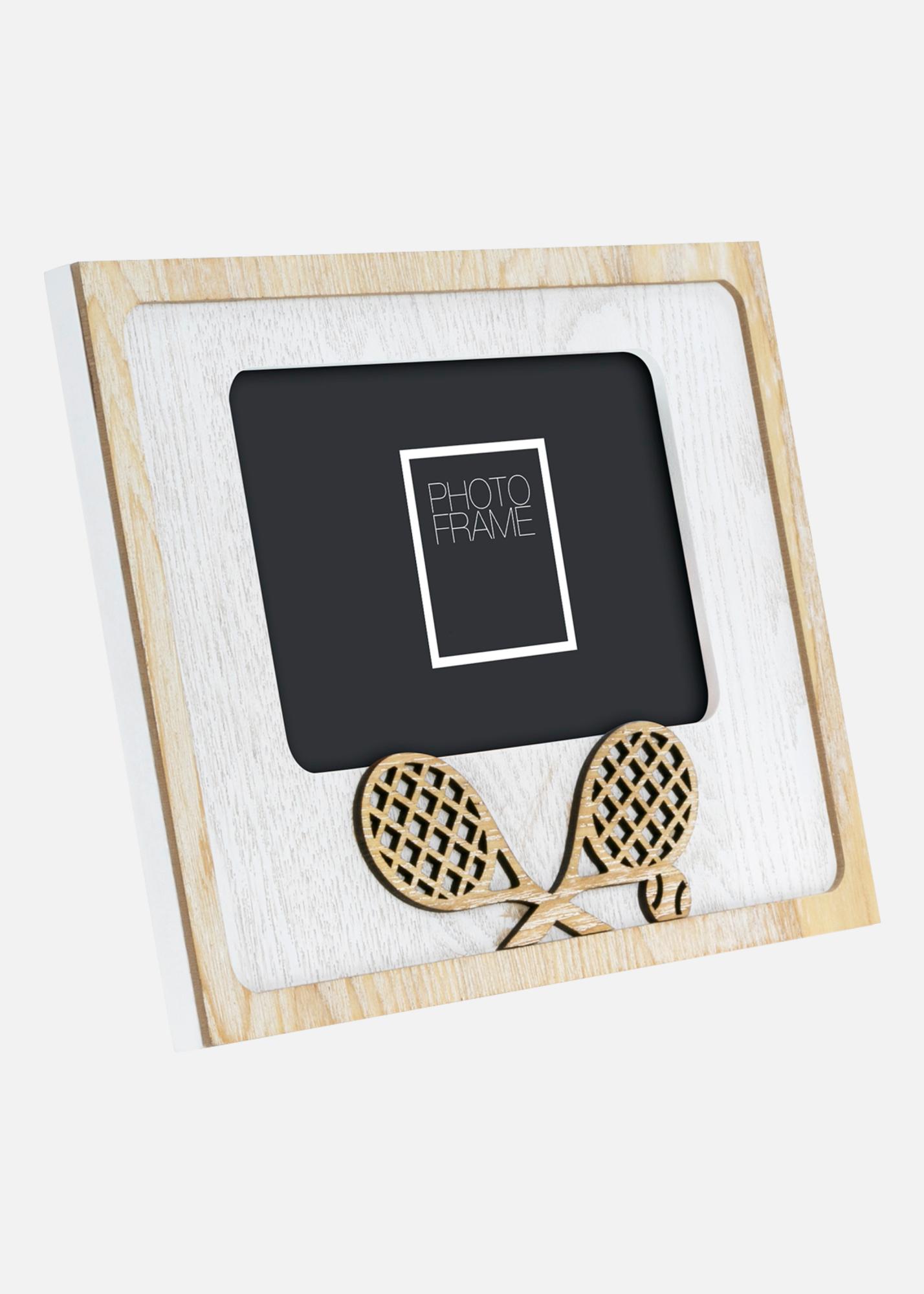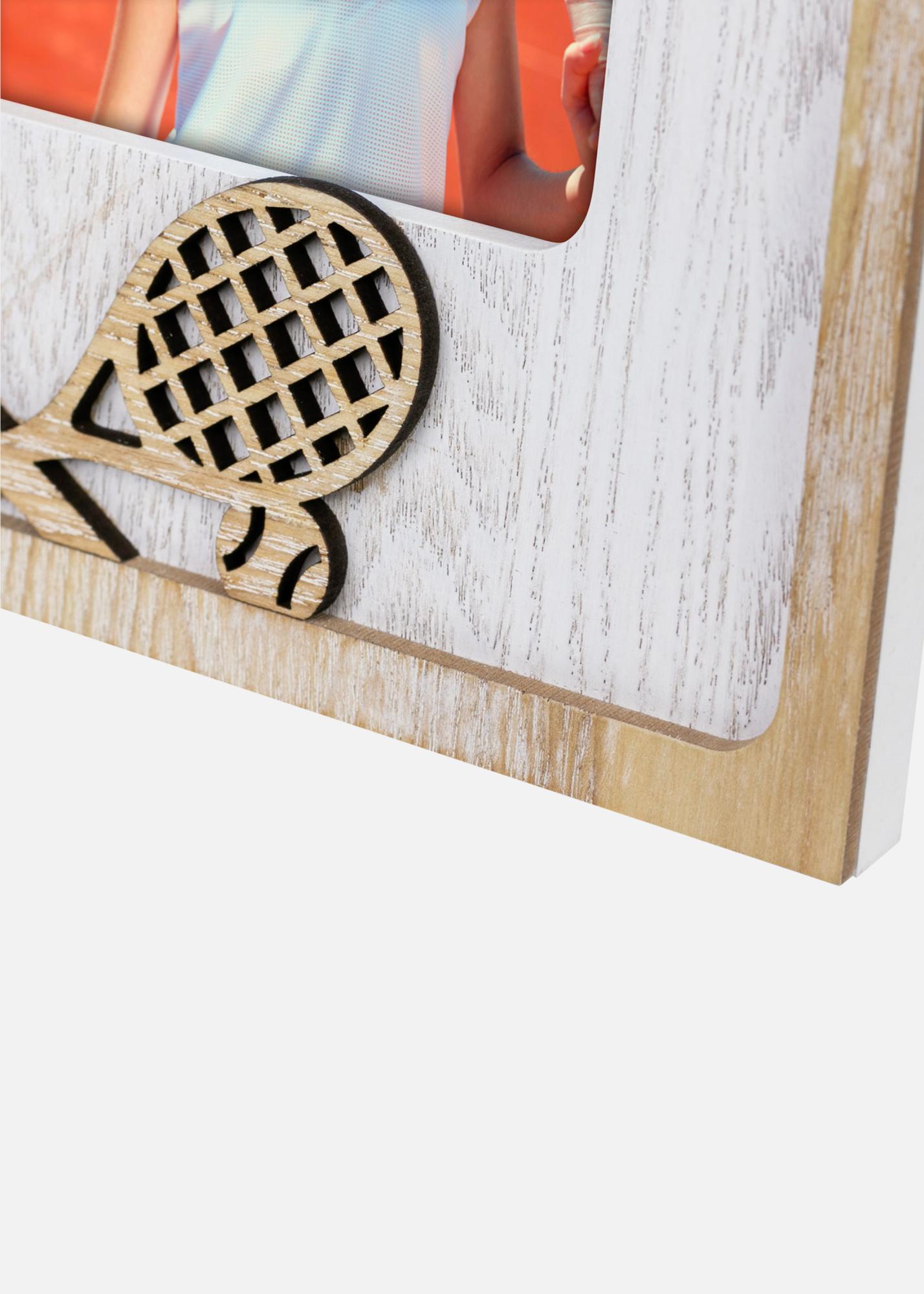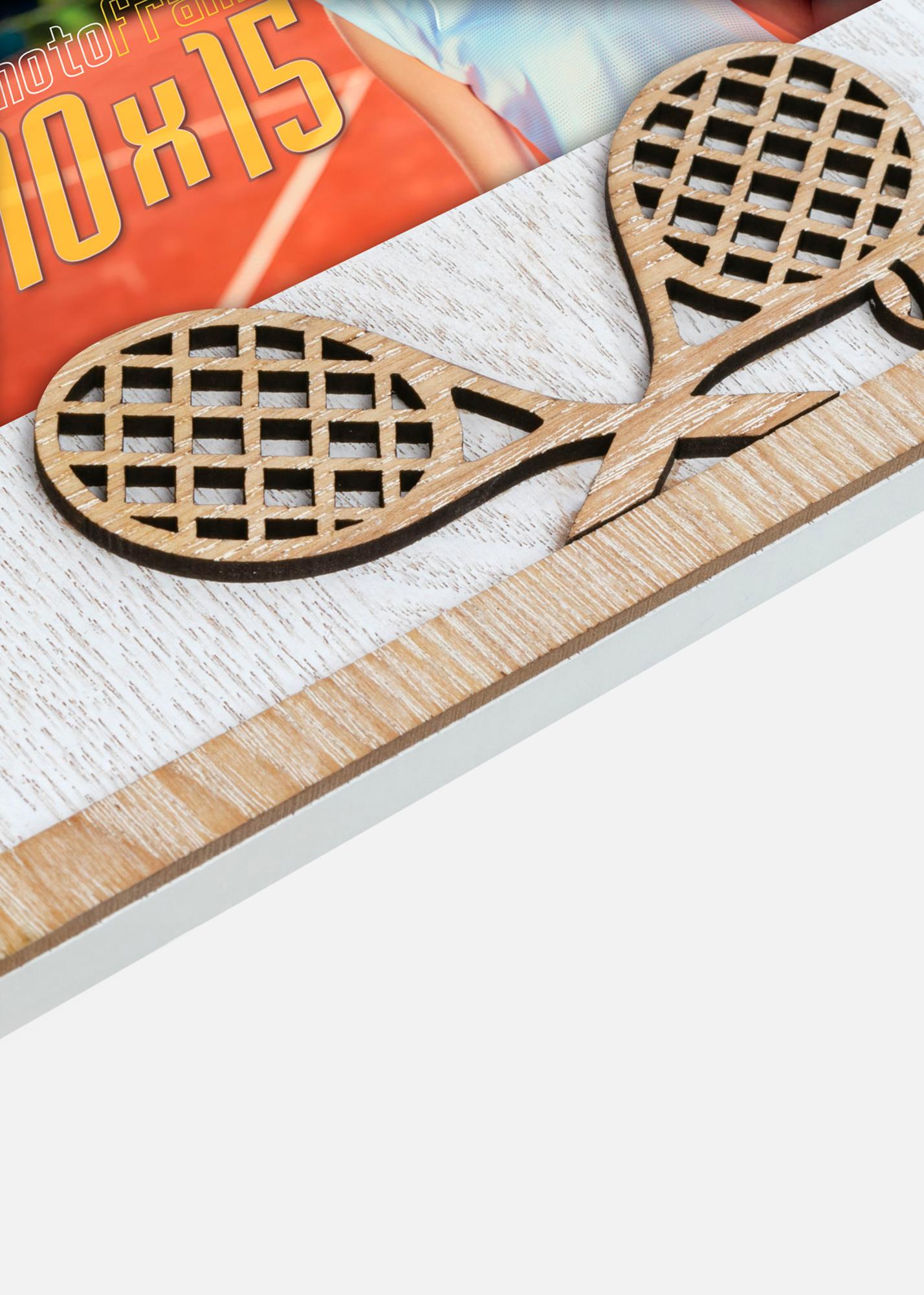 Športom inšpirovaný rám s tenisovou témou. Ozdobený vyrezávanými tenisovými raketami, ideálny na zarámovanie spomienok z tenisového ihriska alebo športových aktivít. Vhodný pre veľkosť obrázku 10x15 cm.