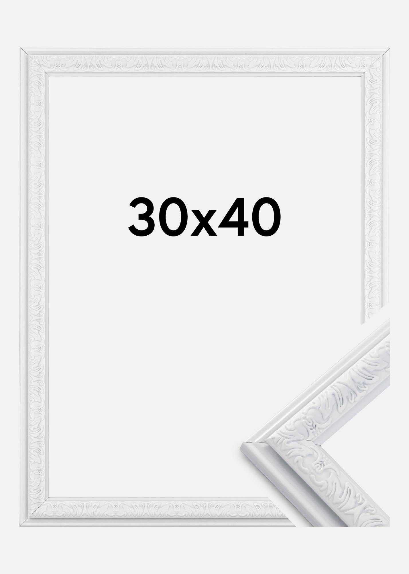 Začni výber rámu »Nostalgia je robustný biely retro rám s krásnymi ozdobami. So svojím širokým profilom sa Nostalgia biela hodí na obrázky, ktorým chcete venovať extra starostlivosť.
