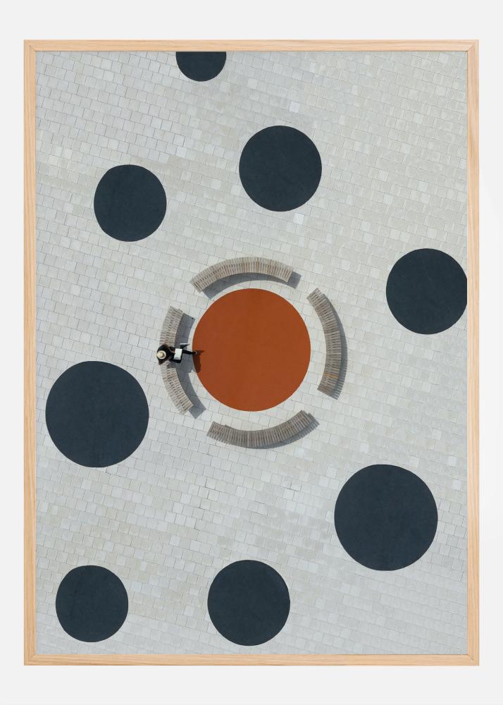 Táto konceptuálna grafika zachytáva výrazný, vtáčí pohľad na osobu čítajúcu, obklopenú symetrickou a grafickou kompozíciou. Abstraktný dizajn bieleho obkladaného povrchu, prerušovaný veľkými čiernymi kruhmi a centrálnym hrdzavočerveným kruhom s lavičkami, poskytuje silný vizuálny kontrast. Tento plagát nie je len poctou dizajnu a architektúre, ale aj hravou interpretáciou každodenných scén.