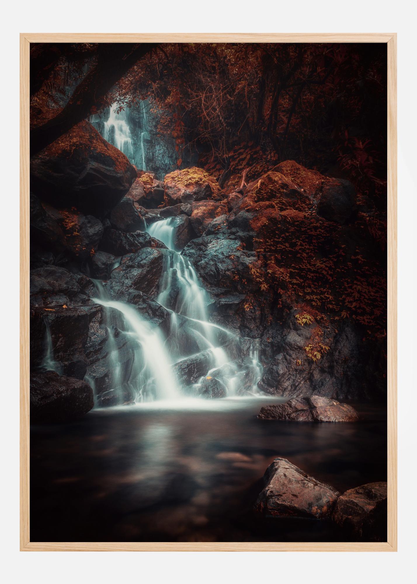 Fantazijny plagát s magickým vodopádom medzi červeným machom a červenými stromami. Temný charakter obrazu prispieva k vytvoreniu magickej atmosféry s jasným bielym vodopádom v pozadí. Cestujte do svojej vlastnej záhrady Edenu v tomto obraze.