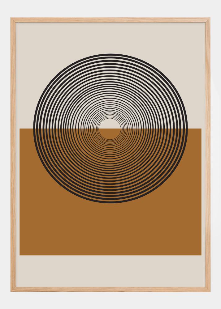 Tento štýlový poster upúta pozornosť svojim hypnotickým vzorom čiernych línií, ktoré vytvárajú vynikajúcu optickú ilúziu, umiestnenú na bohatej okrovej pozadí, ktorá predstavuje horizont krajiny. Horná polovica kruhovej formy evokuje pocit západu slnka alebo východu mesiaca, zatiaľ čo klenuté línie vytvárajú pocit pohybu a hĺbky, čo dodáva tomuto umeleckému dielu retro pocit s moderným prvkom.