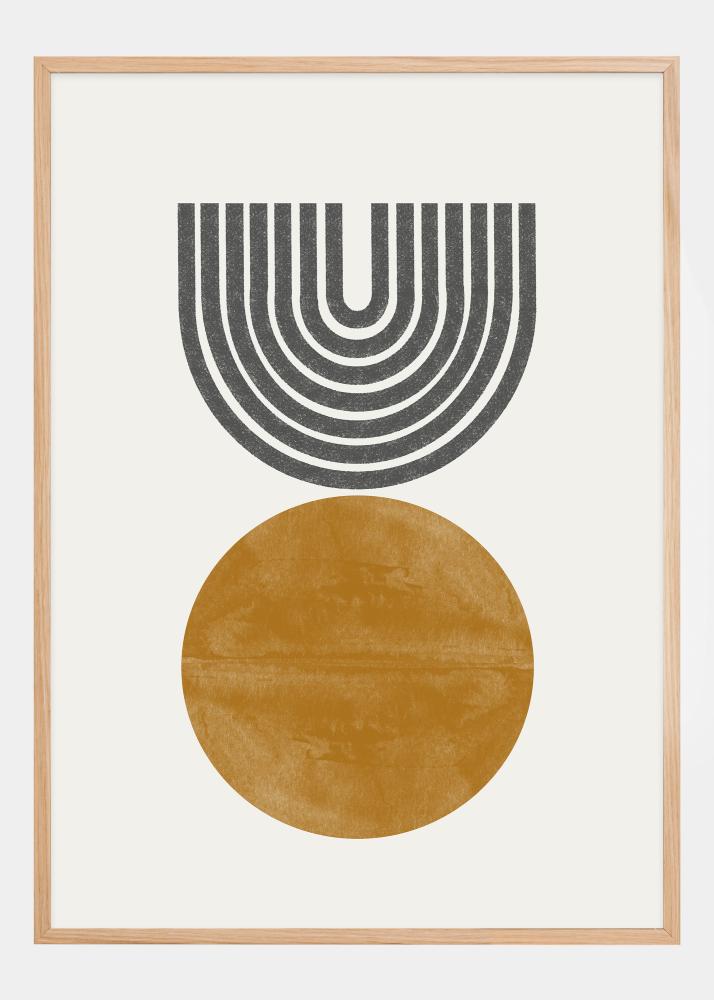 Tento retroinšpirovaný plagát kombinuje geometrickú presnosť s organickými krivkami, vytvárajúci pocit pohybu a retrokúzla. Veľký okrový kruhový objekt na spodku poskytuje silný základ, zatiaľ čo čiernobiele oblúky nad ním pripomínajú zvukové vlny alebo abstraktnú krajinu, čo prináša zaujímavý kontrast a hĺbku.