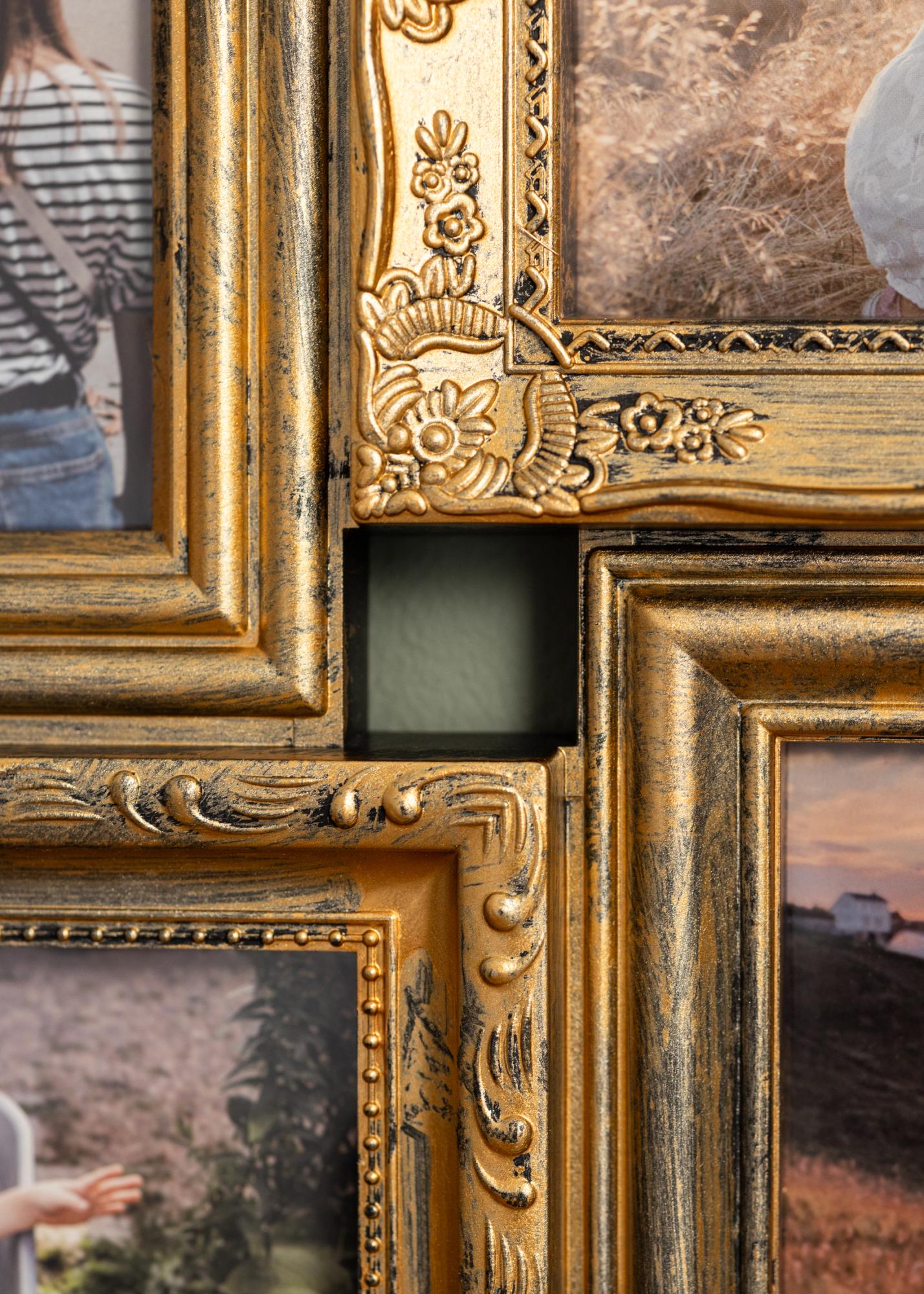 Hľadáte zlatý rám s krásnym retro štýlom, do ktorého sa zmestia všetky vaše obľúbené fotografie? Tento kolážový rám pojme 12 fotografií v stojatej aj ležatej forme, ktoré sa umiestnia symetricky do rámov vedľa seba.